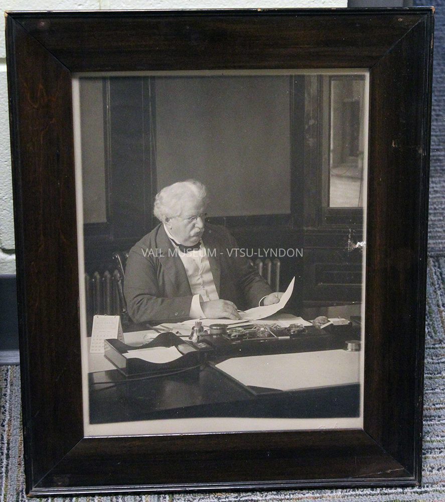 T.N. Vail, founding president of AT&T, is shown in his office at Vail Mansion. The rounded wall with windows and arched radiator behind him suggest he is in one of the towers in his Lyndon Center, VT residence.Cataloged By