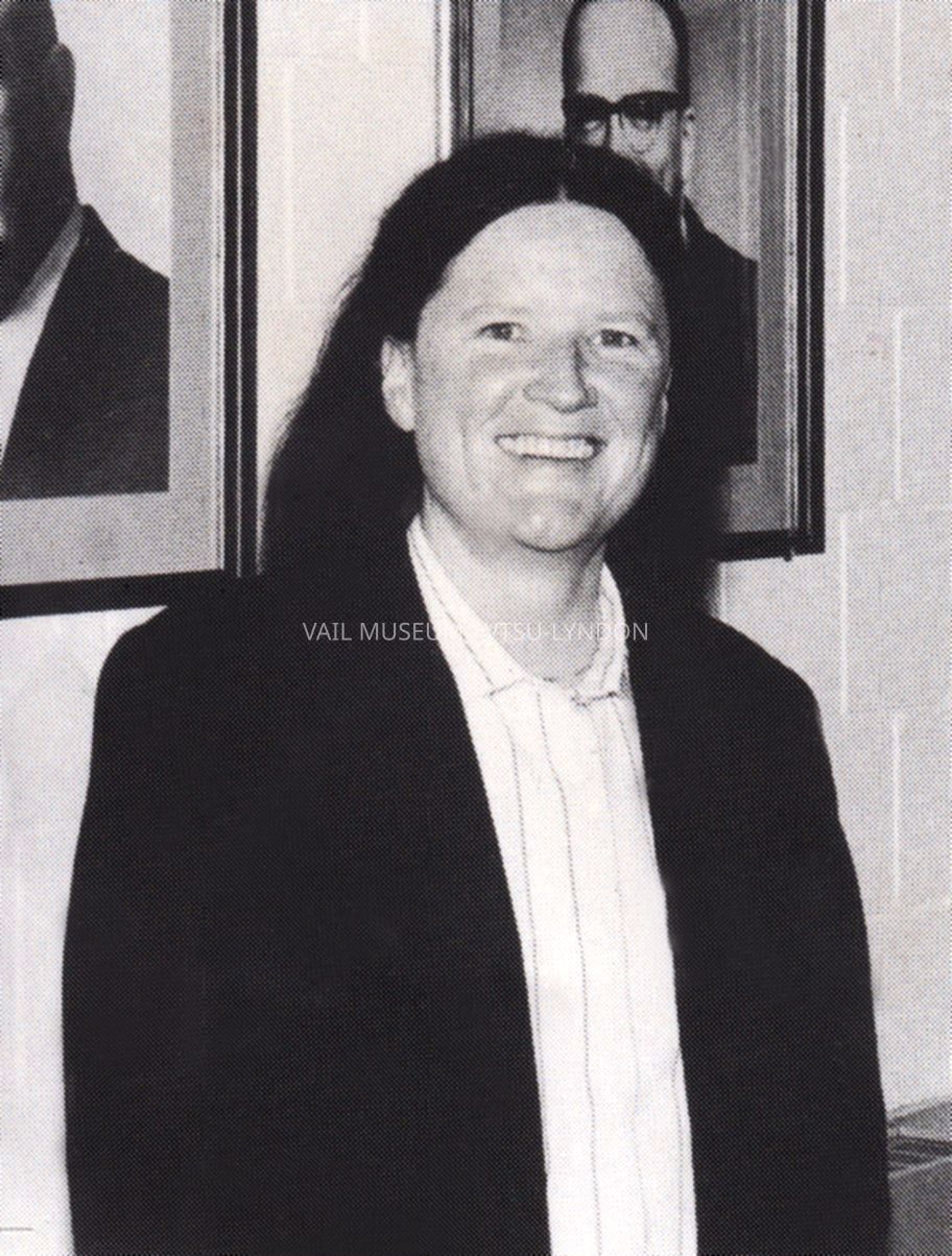 This photo depicts Lyndon State College President Dr. Peggy Ryan Williams standing in the President's Hallway in The Theodore N. Vail Center at an undisclosed time during her tenure as president. Dr. Williams was president from 1989 to 1997, leaving at that time to become the first woman president at Ithaca College in Ithaca, New York. She has since retired, and been named President Emerita at both Lyndon State College and Ithaca College. (see March, 2019 NVU press release below). Note that the black and white screened photo has been partially restored, adjusting both contrast and sharpness to diminish the moire effect of scanning a screened image (the pixelated dot pattern). Anomalies in the scan still exist.Cataloged By