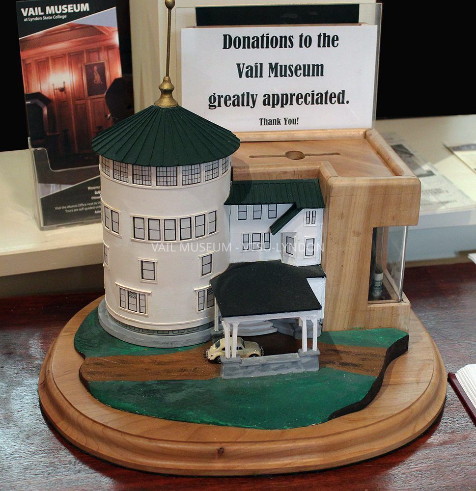 Dick Collins ’53, was the founding member of Manor Vail Society - Lyndon in 2009. He was a vocational educator by profession with a special talent for woodworking. It was his dream to build a free-standing museum on the campus that would stand as a tribute to the Vail Mansion era of Lyndon Teachers College and Lyndon State College. He captured the essence of his vision in this donation box he created for Vail Museum. It was placed in the museum at the time of its dedication in 2012.Cataloged By