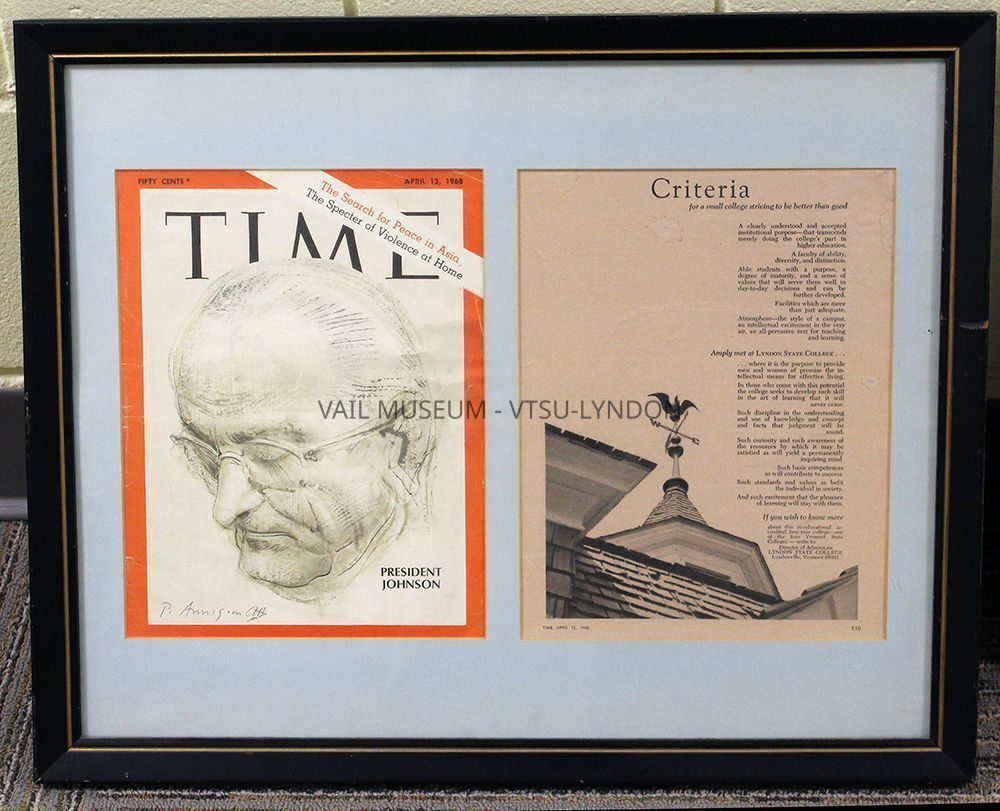 Page E10 is a recruitment layout for Lyndon State College (LSC). This issue of Time is available online at the Time Vault, https://time.com/vault/issue/1968-04-12/page/1/, but does not contain the supplement from which this advertisement was taken. It is speculated that the E before the page number indicated an Education supplement, inserted into this issue of Time. It is not known whether the supplement was a regional insertion or a national one. Other contents of this supplement are also unknown.