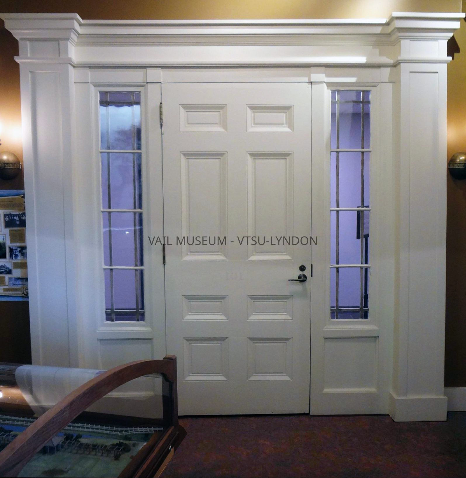Door, Vail Museum front door, including full framing with sidelights, white, original from Bigelow Farmhouse and Vail Mansion. (MVS accession labeling is not attached to the door)Cataloged By