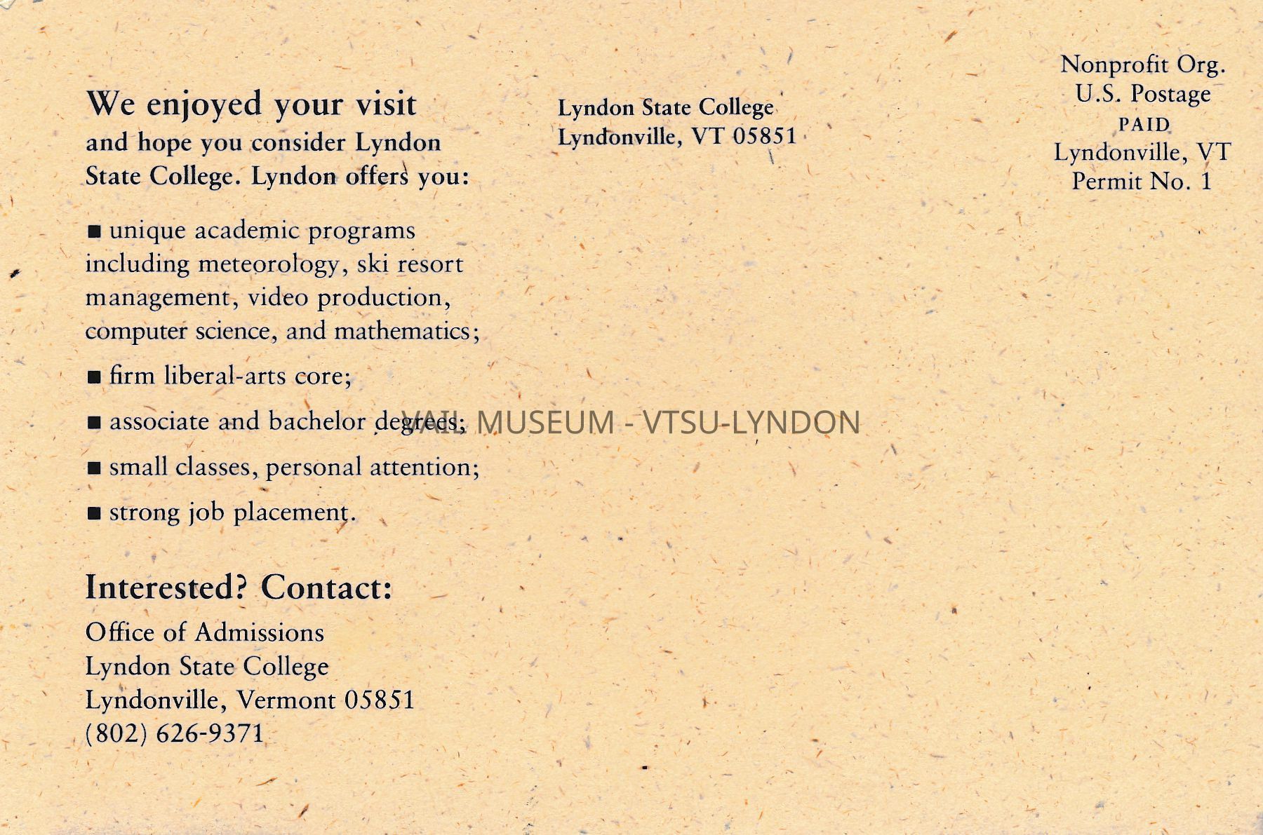This item demonstrates the coordinated effort to encourage potential students to apply for acceptance to Lyndon State College. Most likely, this promotional postcard was sent to potential students who had visited the LSC campus recently, timed to coincide with their decision making process in applying to college.Cataloged By