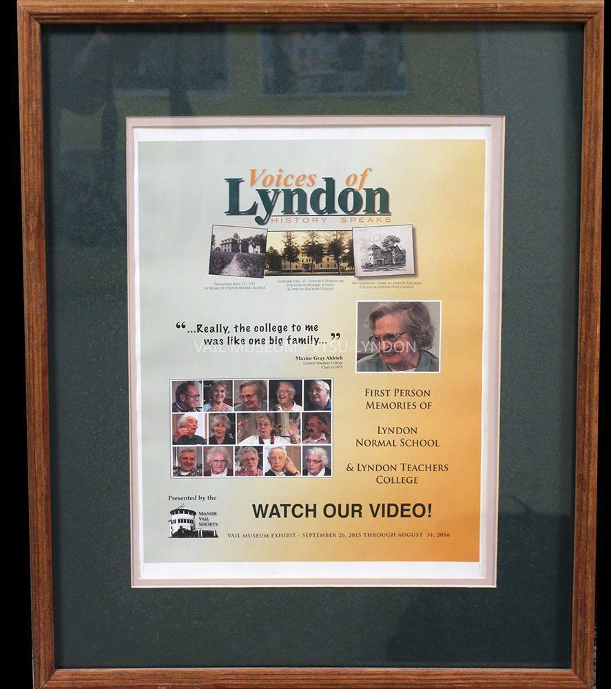 Poster, “Voices of Lyndon”, created by Michael Thurston for 2015 MVS Homecoming Presentation Vail Museum Exhibit, with individual photo of Maxine Gray Aldrich class of 1955, brown wooden frame w/ green matting.Context