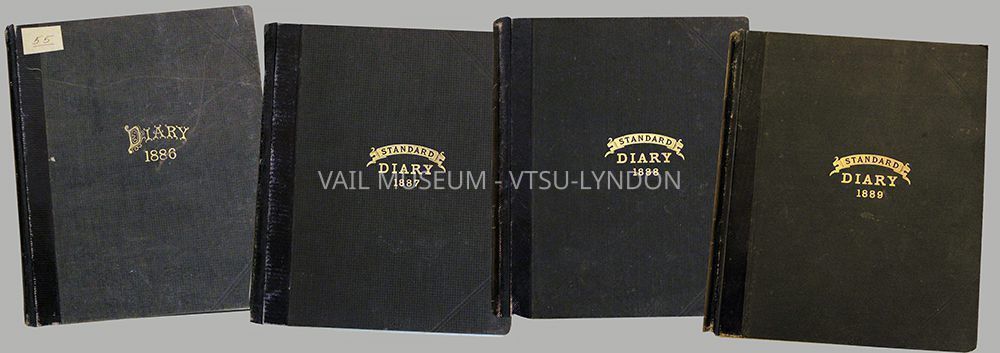 Diaries – Vail Farm Diaries 1886,1887,1888,1889. The accounts of the Harris Farms known as “The Mall” – and also the records in conjunction with the Vail-Harris Farming agreement on the Vail farm. An account of the daily chores, planting dates, haying, horse breeding, etc. Most of the notes are inscribed by Irving Powers, manager of the two farms and later president of the Lyndon Creamery and the Lyndonville Savings Bank; he lived in the Pettigrew/Powers/Watson/Boera home on the park in Lyndonville and donated the land for Powers Park and an endowment for its maintenance. Bookplate in 1886 Diary notes that the civil-minded town benefactor who owned The Mall is “L.B.Harris, 1847-1913, Civil War Veteran, Connoisseur, Gentleman…Lyndon Center, VT.” Mr. Harris was the founder of the Lyndonville Savings Bank and donated the Donatelli Lions and the Boar statute to his community, presented by Elizabeth Harris Brown, 1976.Cataloged By