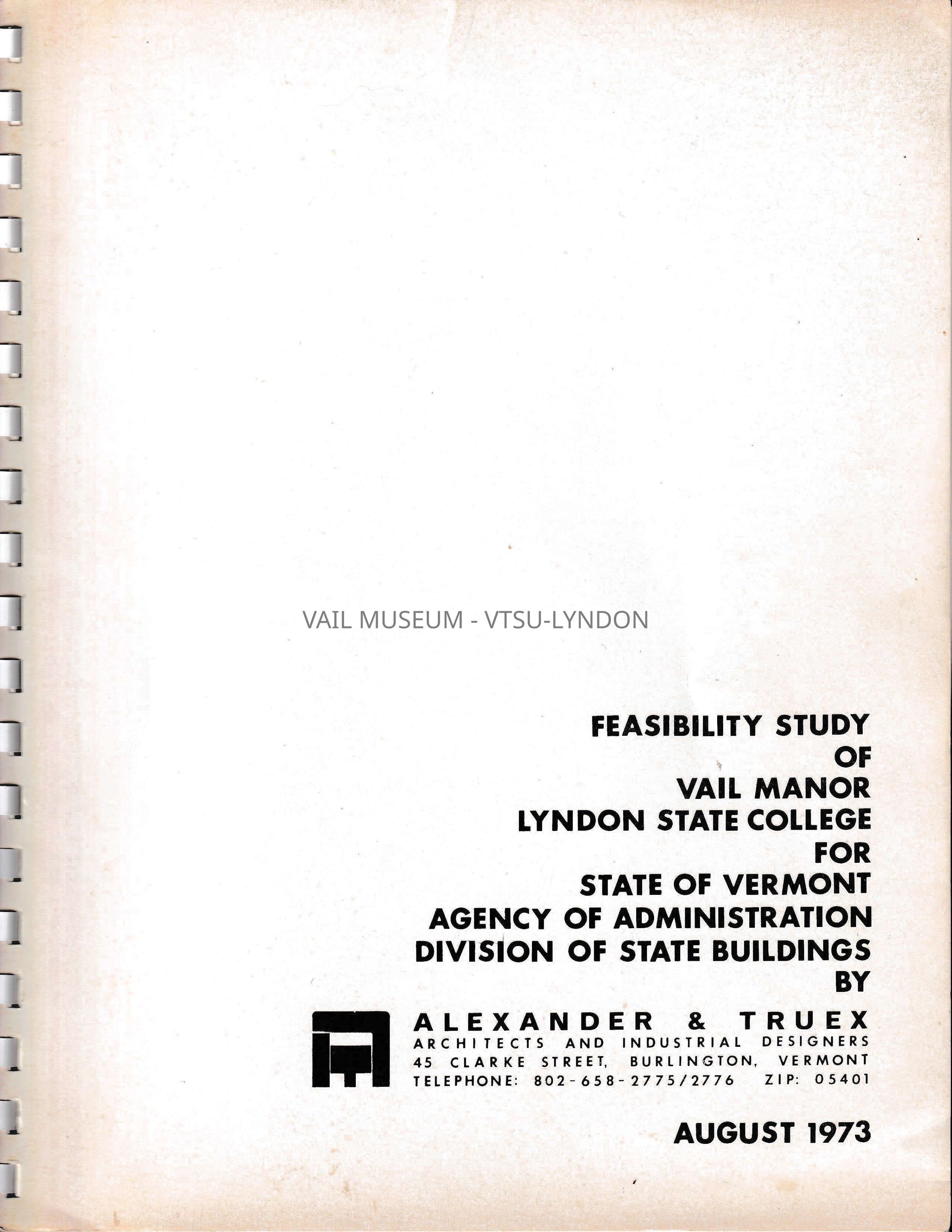 This is the document that was commissioned by the State of Vermont from Alexander & Truex, Architects of Burlington, Vermont in 1973 to assist in the engineering and financial overview of how to deal with Vail Mansion on the Lyndon State College Campus in Lyndon Center, Vermont. The mansion was the Vermont home of Theodore N. Vail, the founding president of AT&T. The mansion and its 100+ rooms had been the centerpiece of the college since 1951 when Lyndon Teachers College moved up the hill from Lyndon Institute to its first dedicated campus, under the direction of LTC president Rita L. Bole.Context