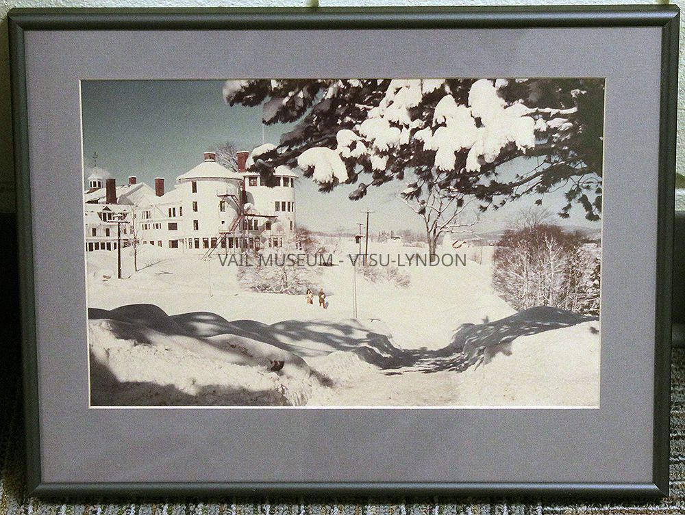 Photo, Scene of Manor Vail in winter, circa early 1970s, color, in black medal frame by The Drawing Board with gray matting, taken by and donated to the Vail Museum, June 2014 by Lorna Lafam CartyCataloged By