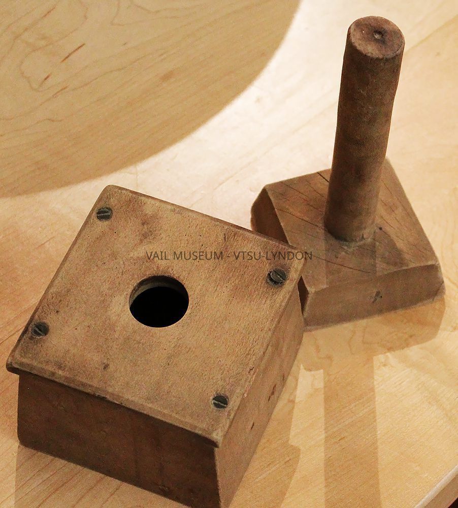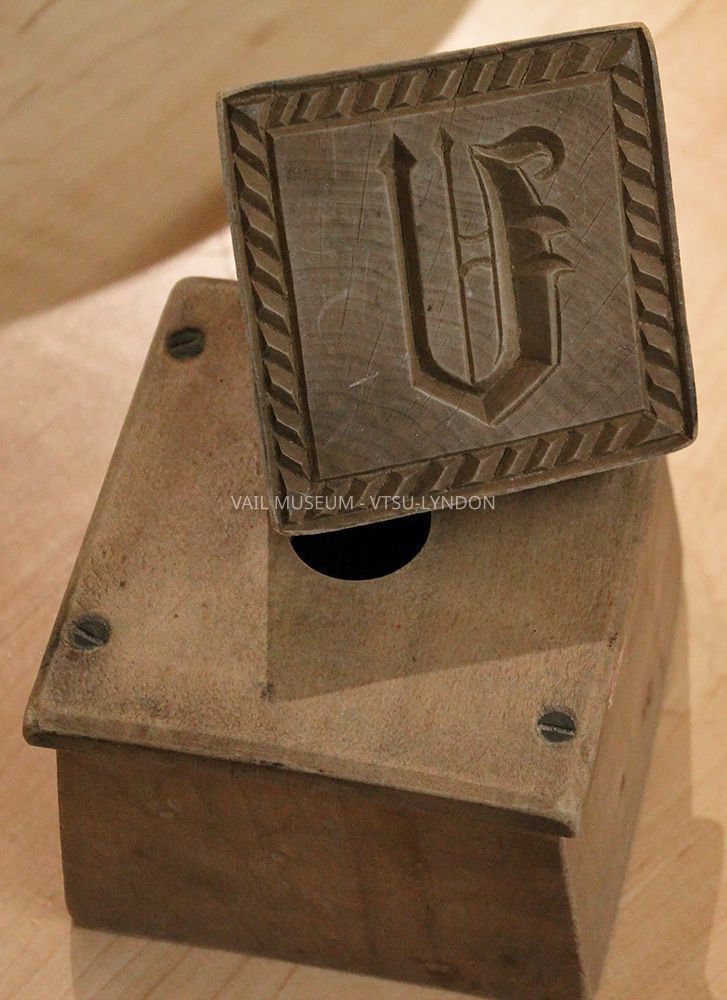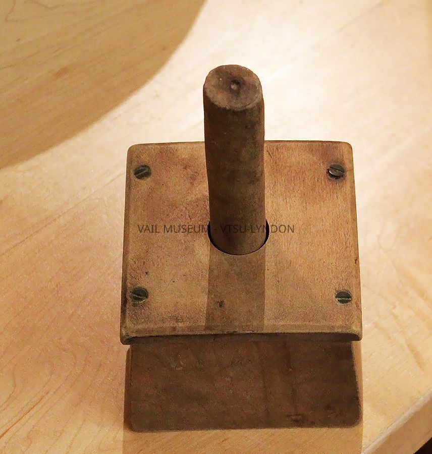 A butter press was used to create shaped blocks of butter. In many instances, these presses would imprint a design, an image or a letter to signify the origin of the imprint. In this case, the block of butter would be embossed with a raised letter V, for Vail.Cataloged By