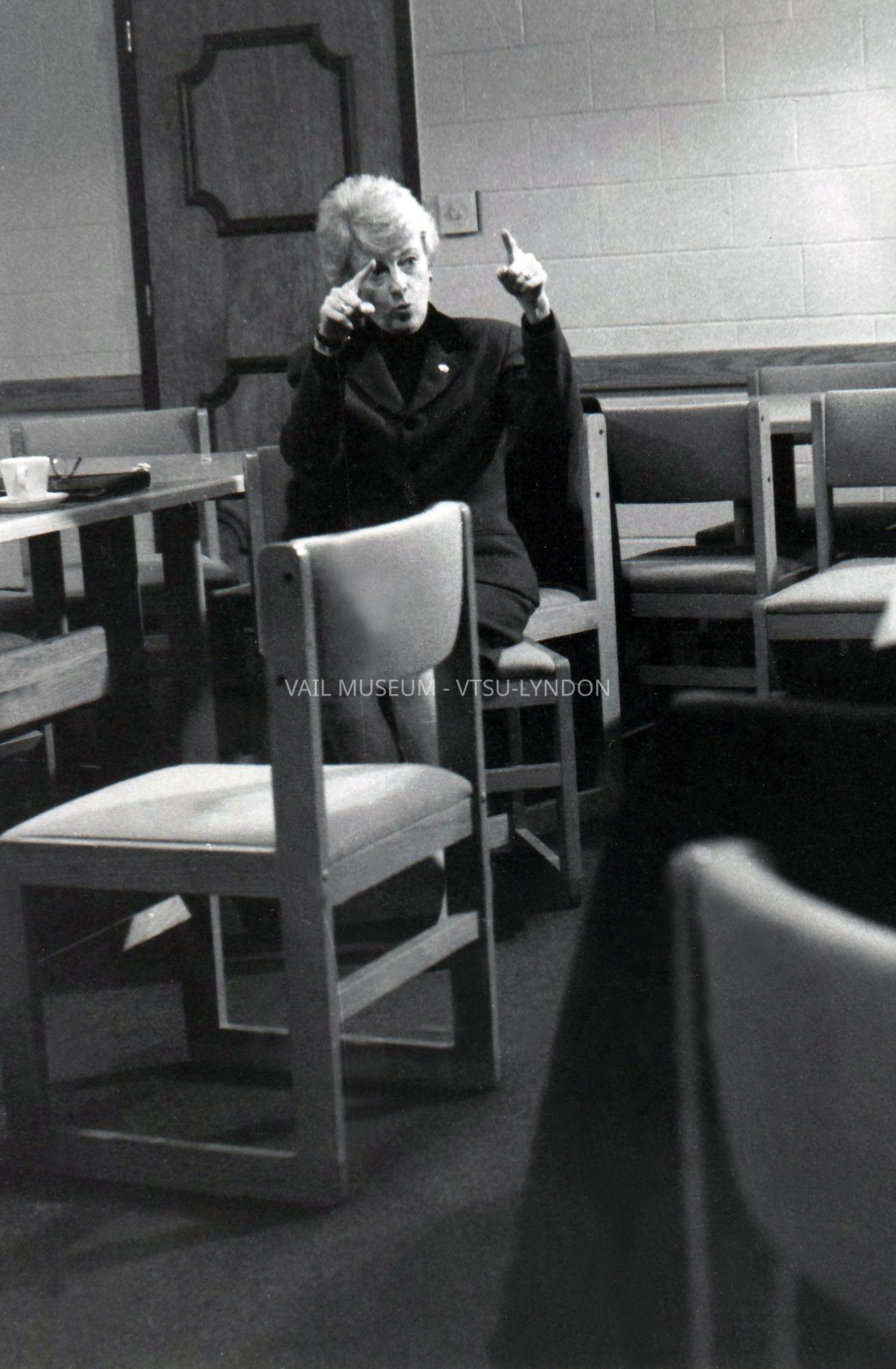 This is a black and white photograph of Lyndon State College President Carol Moore making a point in 1998 to an unidentified colleague seated in front of her. This photograph is from a large gift of photographs and archived editions of The Critic, the student newspaper of Lyndon State College at the time. The Critic gifted this collection to Vail Museum in 2022. As this image was digitized, contrast was increased as the original looked bleached out. Partial digital restoration has also been performed on this image, as the original has some significant surface scratches.Cataloged By