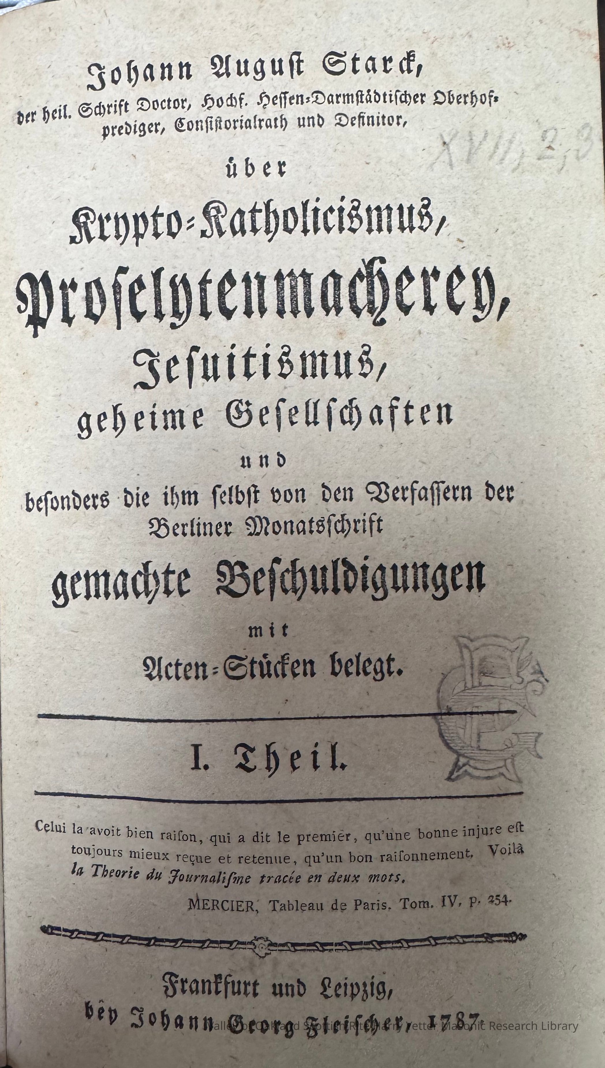 A theologian, Starck argued that an Illuminati-led conspiracy precipitated the French Revolution. He promoted a clerical brand of Templarism and co-founded a lodge belonging to the Rite of Strict Observance. For a time, he lived next door to the philosopher Immanuel Kant.Collection