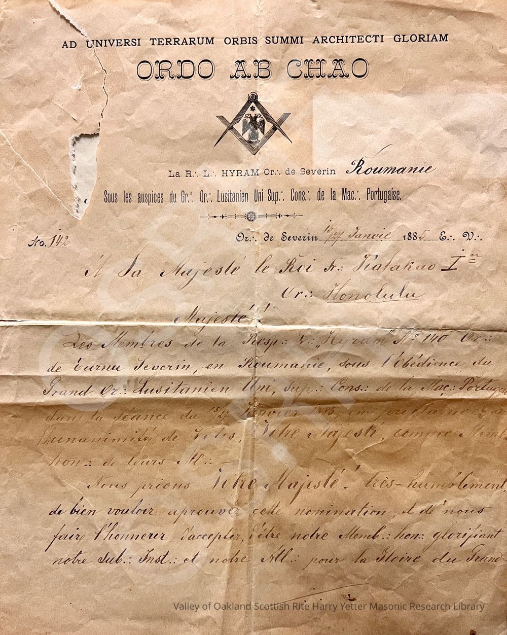 January 1885 Letter of Recommendation from Lodge Severin in Romania for King Kalākaua of HawaiiContext
