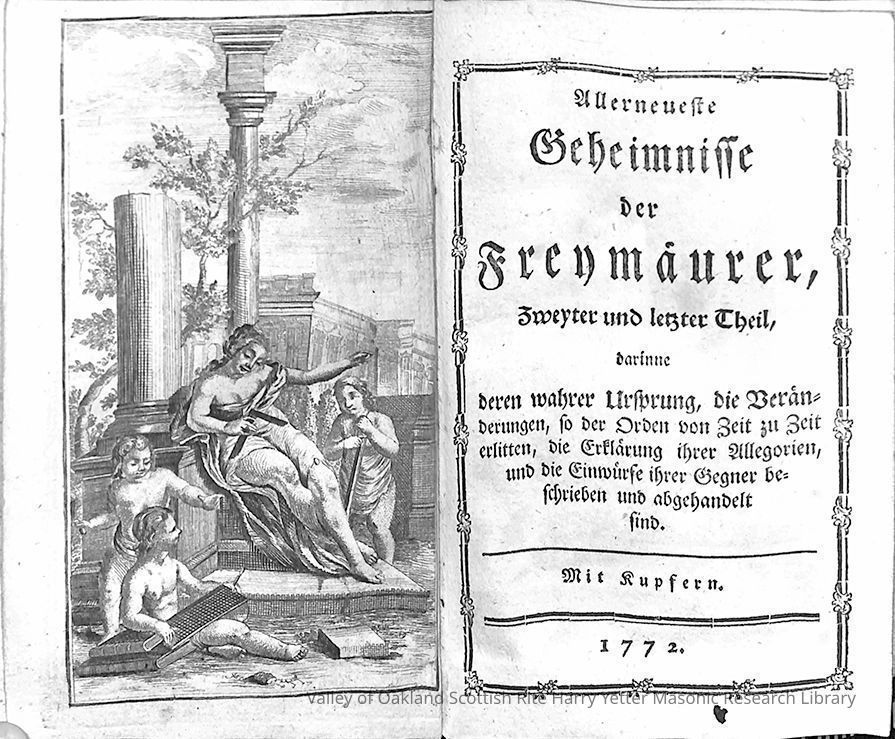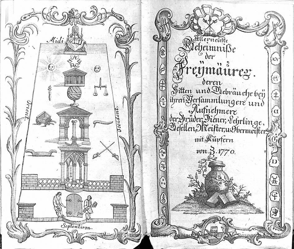 An anonymous Masonic exposé attributed to the Abbé Larudan, originally published in 1747 under the title, “Les Francs-Maçons écrasés” (The Freemasons Crushed). This German edition was published twenty-three years later, in 1770 under the title, "Allerneuste Geheimniße der Freymäurer, deren Sitten und Gebräuche bey ihren Versammlungen und Aufnehmen der Brüder, Diener, Lehrlinge, Gesellen, Meister, u. Obermeister." (The Latest Secrets of the Freemasons, their manners and customs at their meetings and receiving the brothers, apprentices, journeymen, masters and senior masters.)