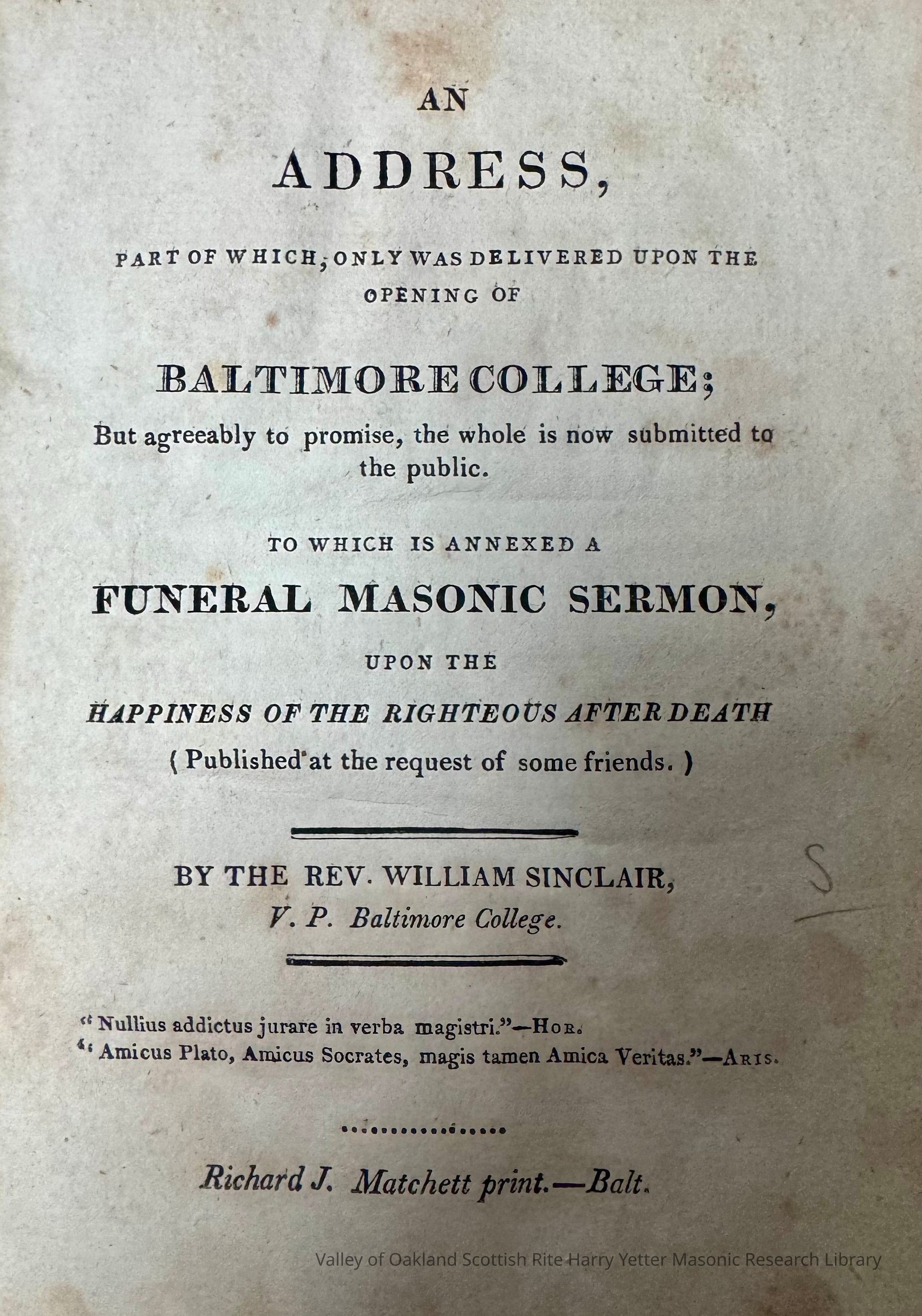 Address at the opening of Baltimore College, published with a Masonic funeral sermon.Context