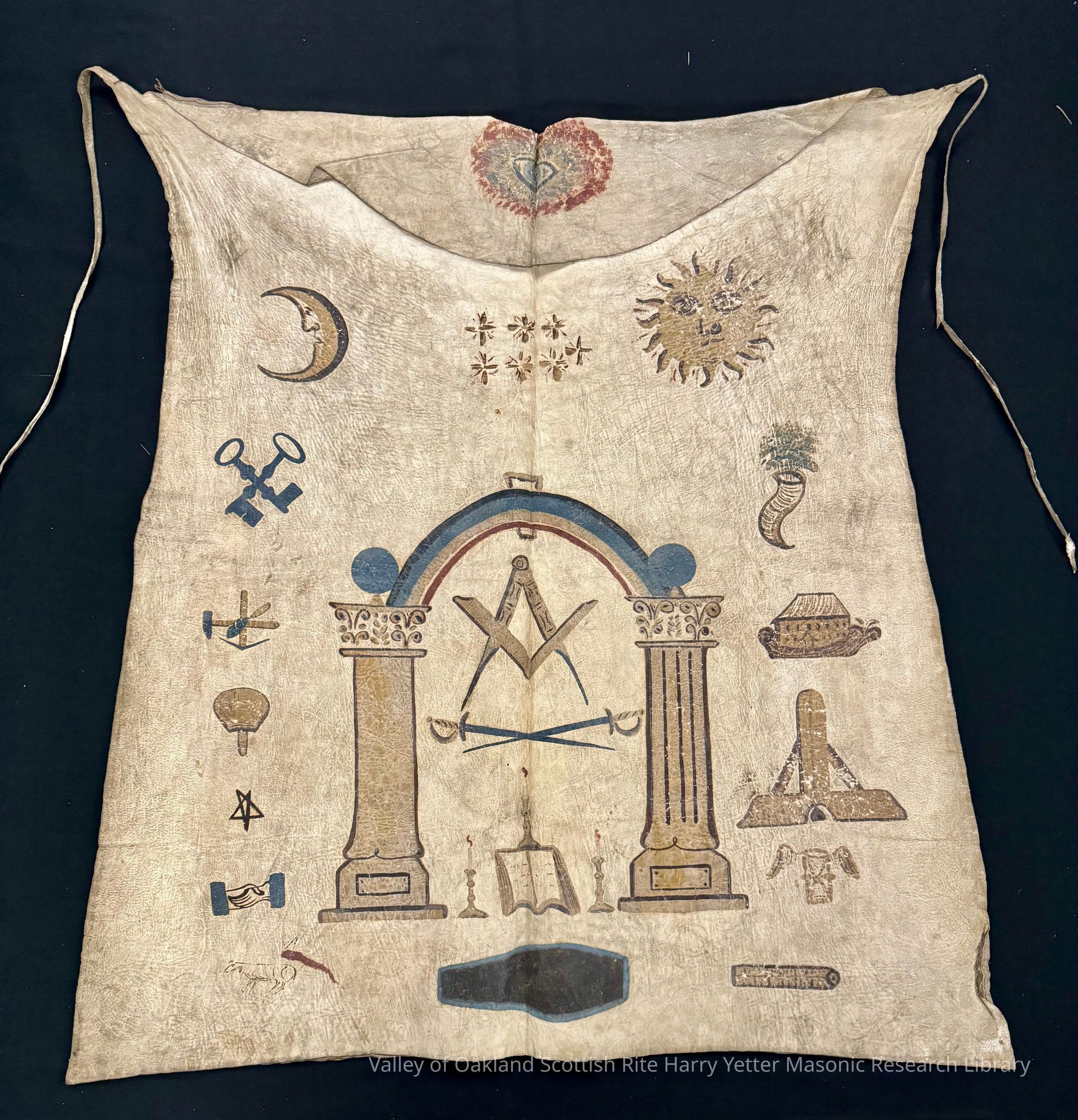 For use in lodge meetings and ceremonies. Note its length, which is longer than modern aprons. Typically, the longer aprons not only mimicked those worn by operative aprons but also matched with the long frock coats worn by men during the era.Context