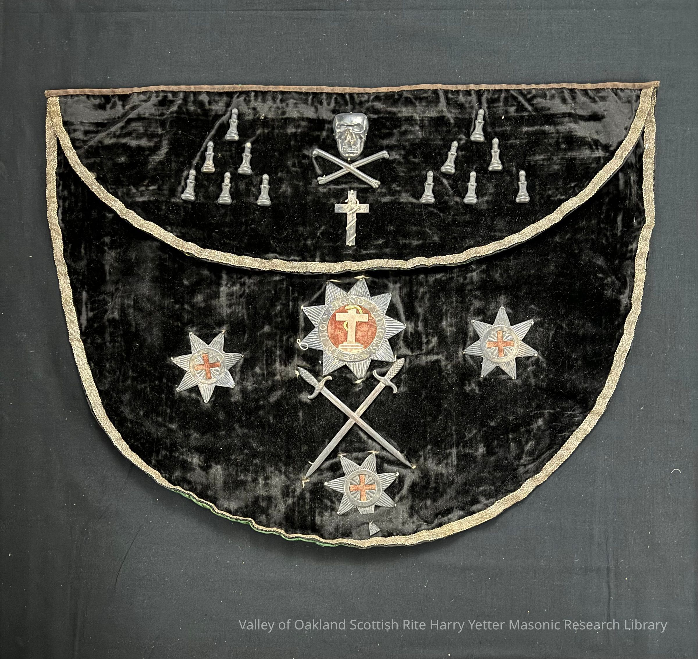 Black velvet Knights Templar apron adorned with pewter emblemsUse