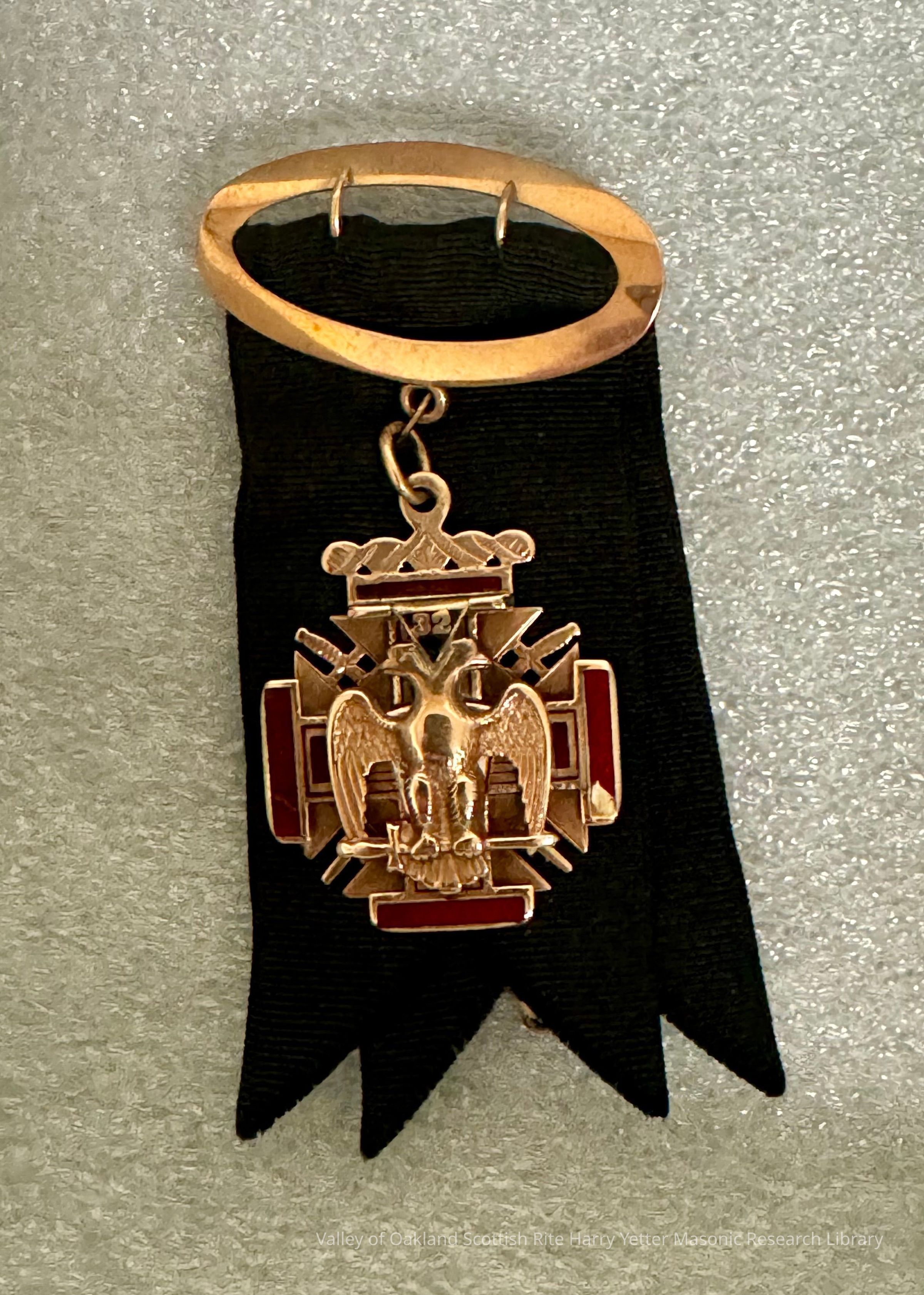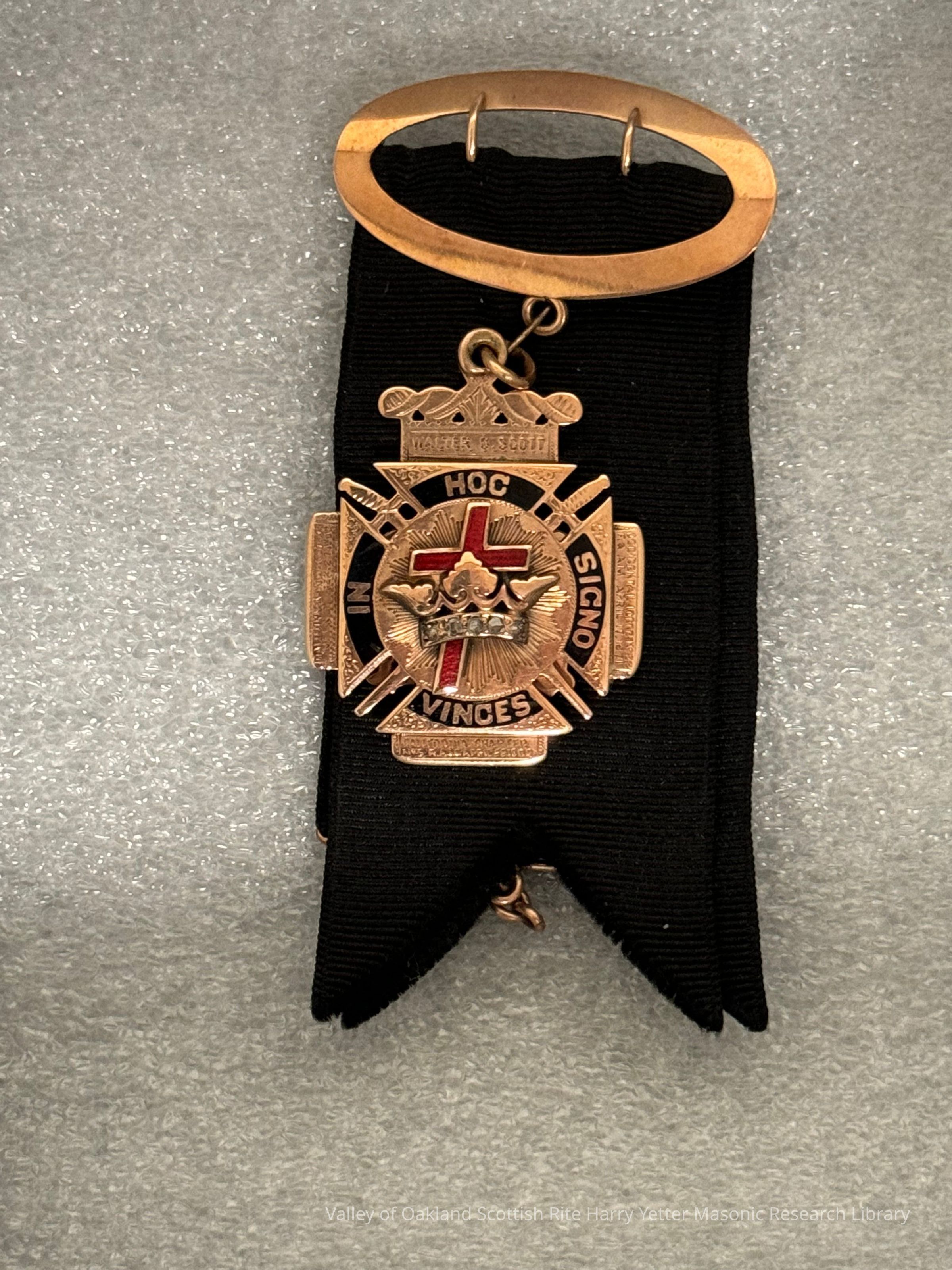 Scottish Rite and Knights Templar Jewel on reverse surmounting a black grosgrain ribbon. Jewel is attached by a circular pin at top. Gold plate. There are four distinct inscriptions: Walter D. Scott, Occidental Lodge No. 22 F. & A.M. (San Francisco) April 17, 1871; California Chapter No. 5, RAM, April 22, 1903; California Commanders No. 1, KT, February 27, 1903.Item Type