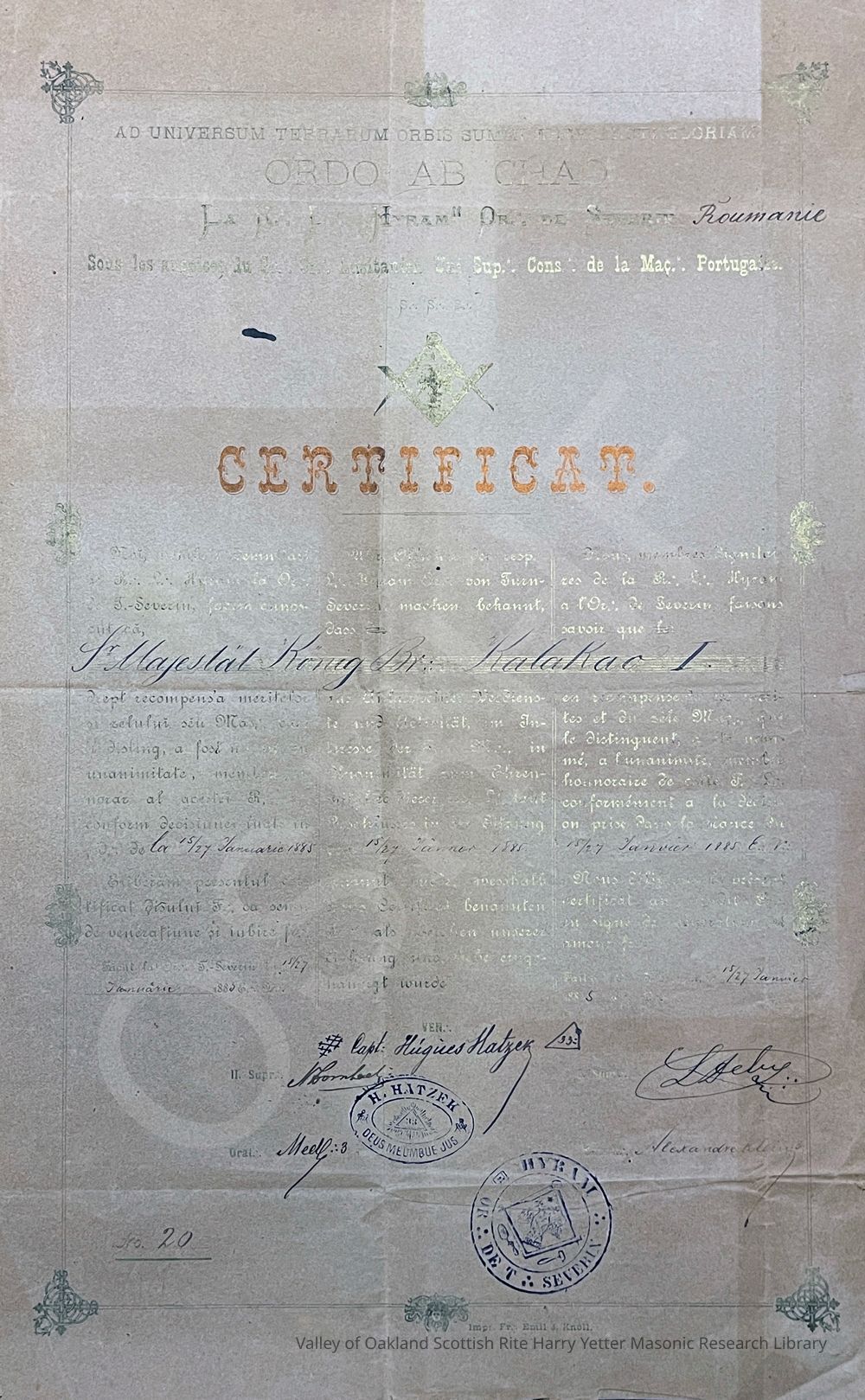 Certificate on paper issued by the Romanian lodge, Hyram, to King Kalakaua of Hawaii, 1885.Context