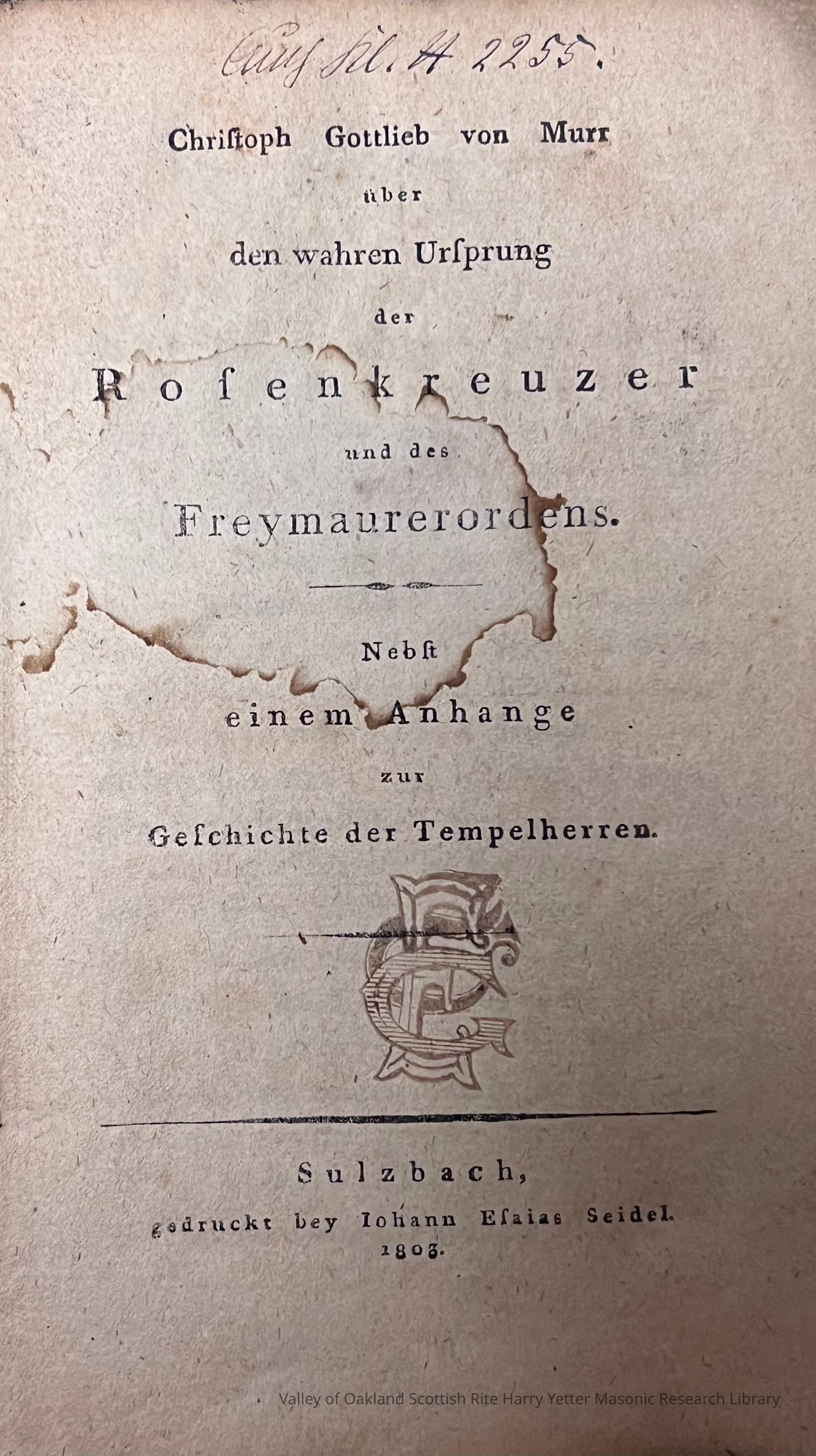 Christopher Gottlieb von Murr uber den Wahren Ursprung der Rosenkreuzer und des FreymaurerordensEntry/Object ID