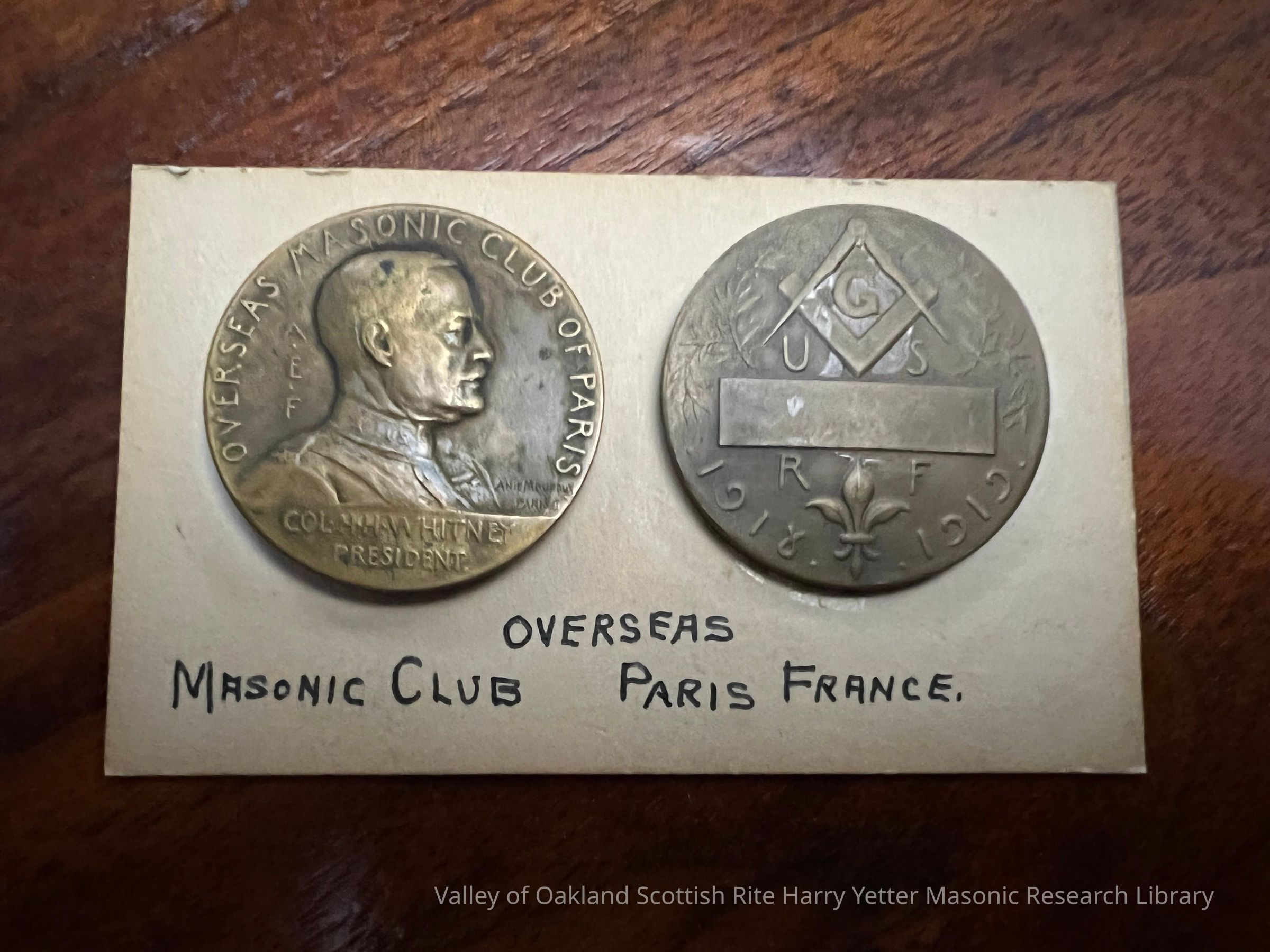 The reverse and obverse depiction of the Overseas Masonic Club of Paris, 1918–1919. A set of two; one belonging to Bro. Maurice S. Stewart of Oakland California.Context