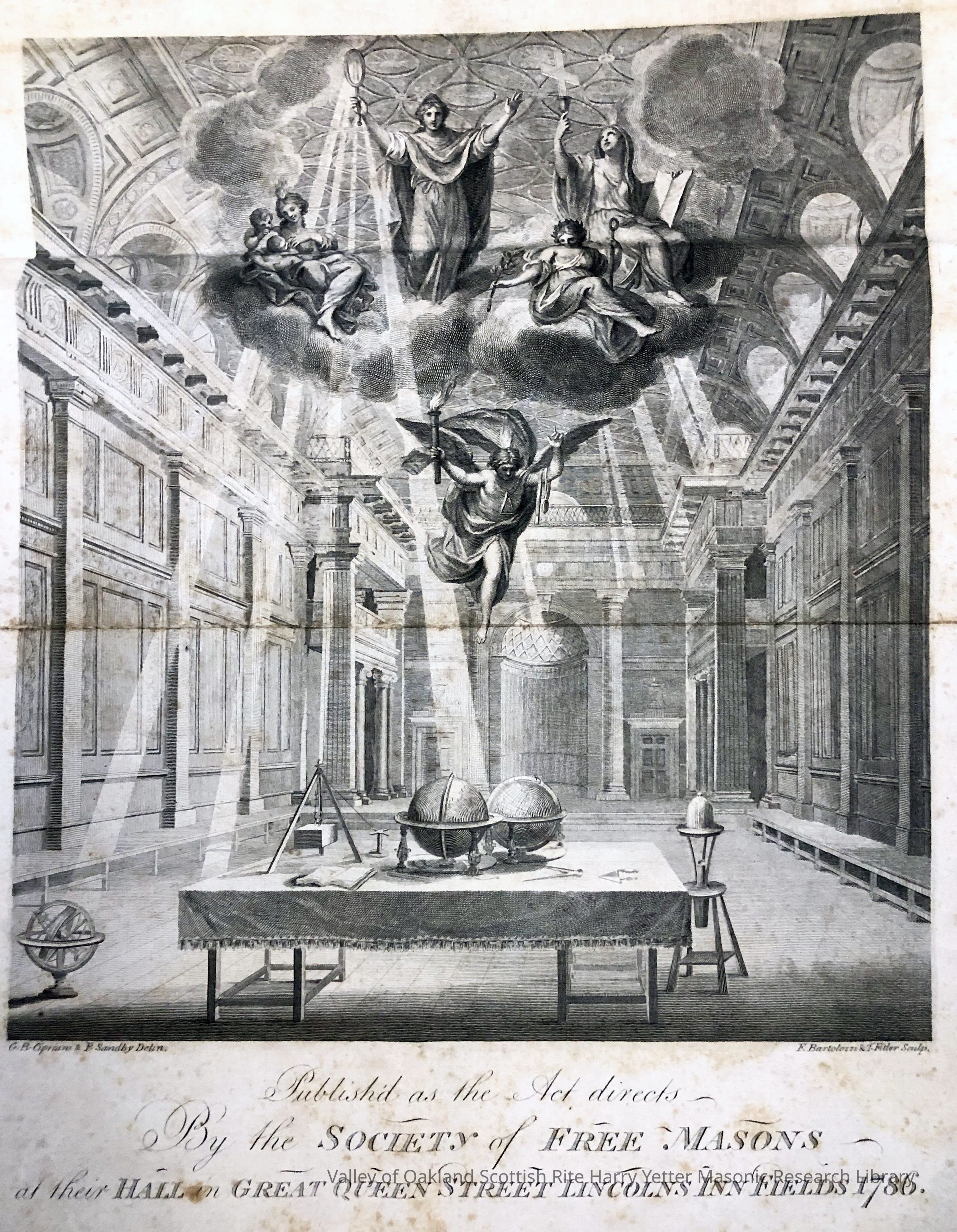 1784 Revision of James Anderson's seminal work. It contains a foldout of the old Freemasons' Hall at the Connaught Rooms in London with Faith, Hope, and Charity descending in a glory onto a Master's table flanked by globes. Foldout was engraved by F. Bartolozzi.Collection