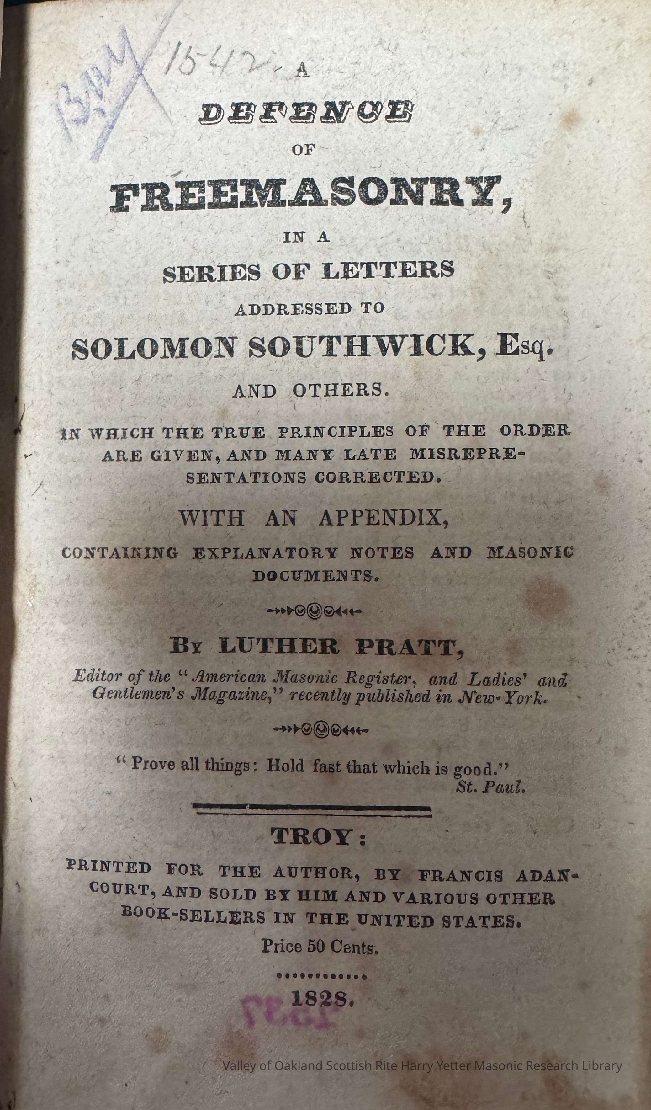 Written and published during the Anti-Masonic period.Collection