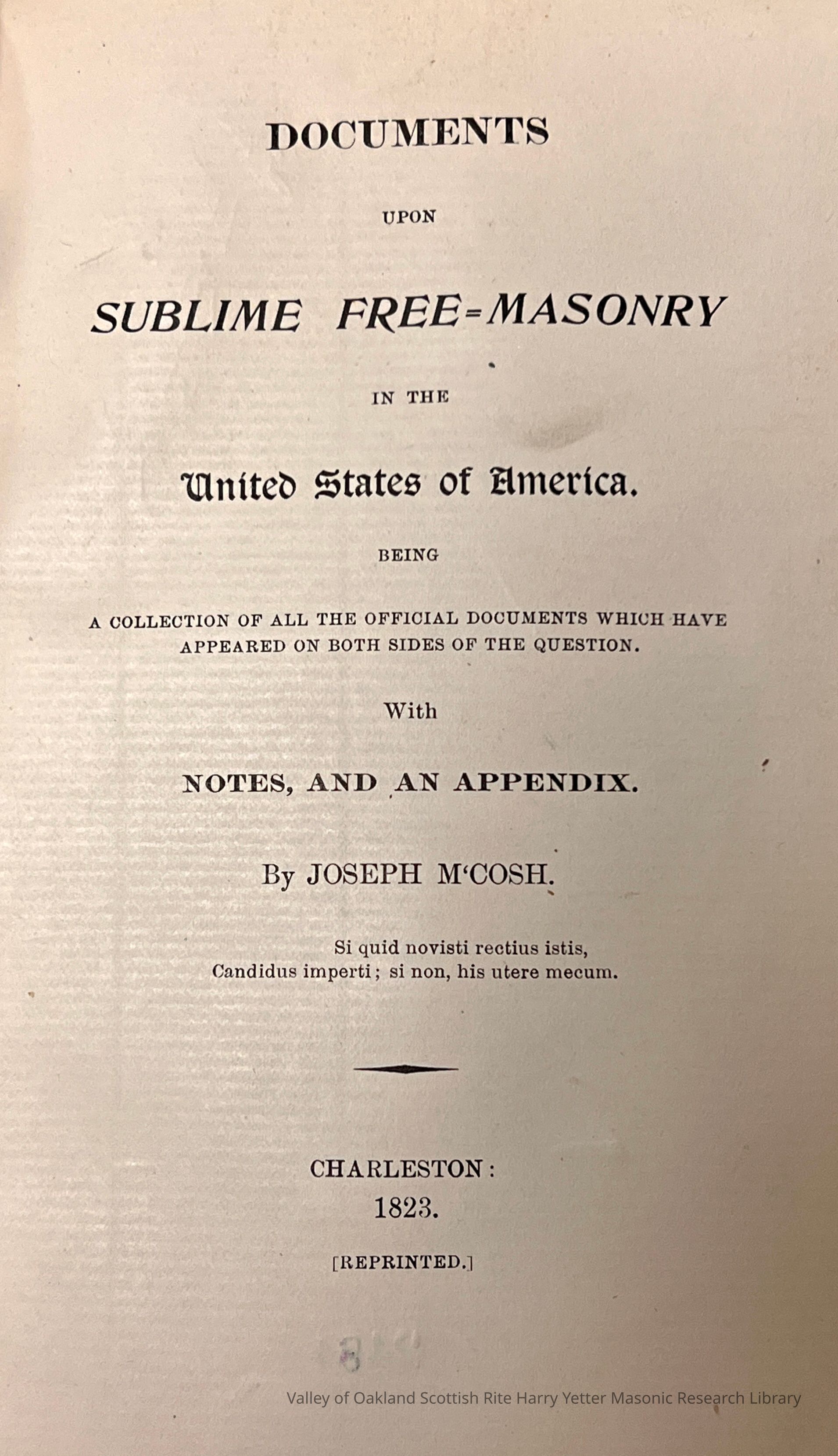 Contemporary accounts of the conflict between the two Masonic bodies. According to Masonic scholar and author, Michael Poll, "This is one of the most controversial small books ever published on the Scottish Rite "wars" involving Joseph Cerneau. Originally published to expose the irregularity of the Cerneau Scottish Rite, Joseph McCosh, an SGIG in the Charleston Supreme Council (today, Southern Jurisdiction), was nearly put on trial by the Grand Lodge of South Carolina as a result of the publication. In addition, the Charleston Council was forced to disavow and destroy copies of the work. This photographic reproduction of this extremely rare publication provides new insights into this fascinating work as well as new discoveries about it. The foreword by Michael R. Poll dissects the events surrounding the publishing of the booklet along with the known information to provide a fresh analysis of the times and events." (source: https://cornerstonepublishers.com/documents/)Collection