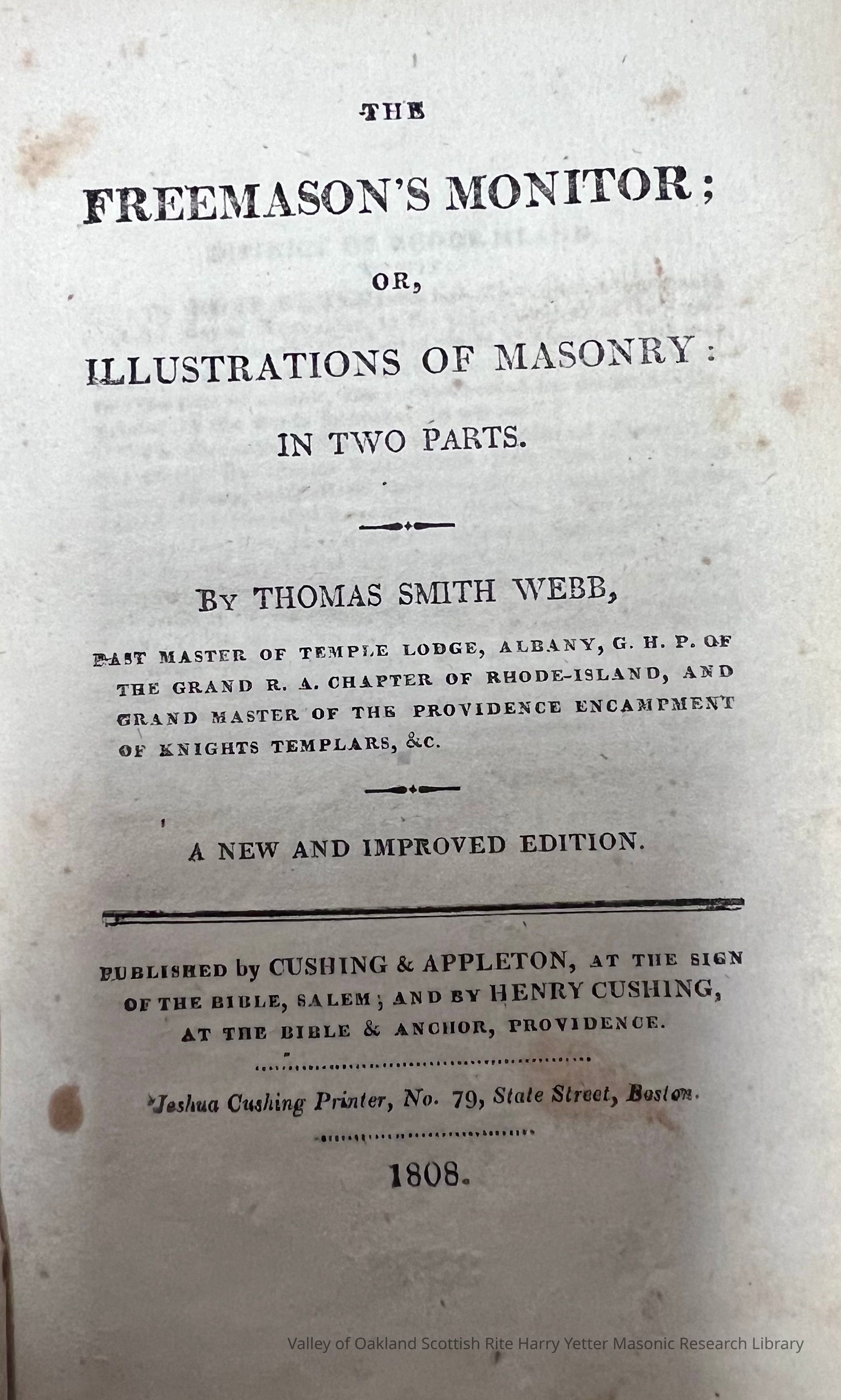 Thomas Smith Webb's influential work that influenced the landscape of Freemasonry in the United States.Collection