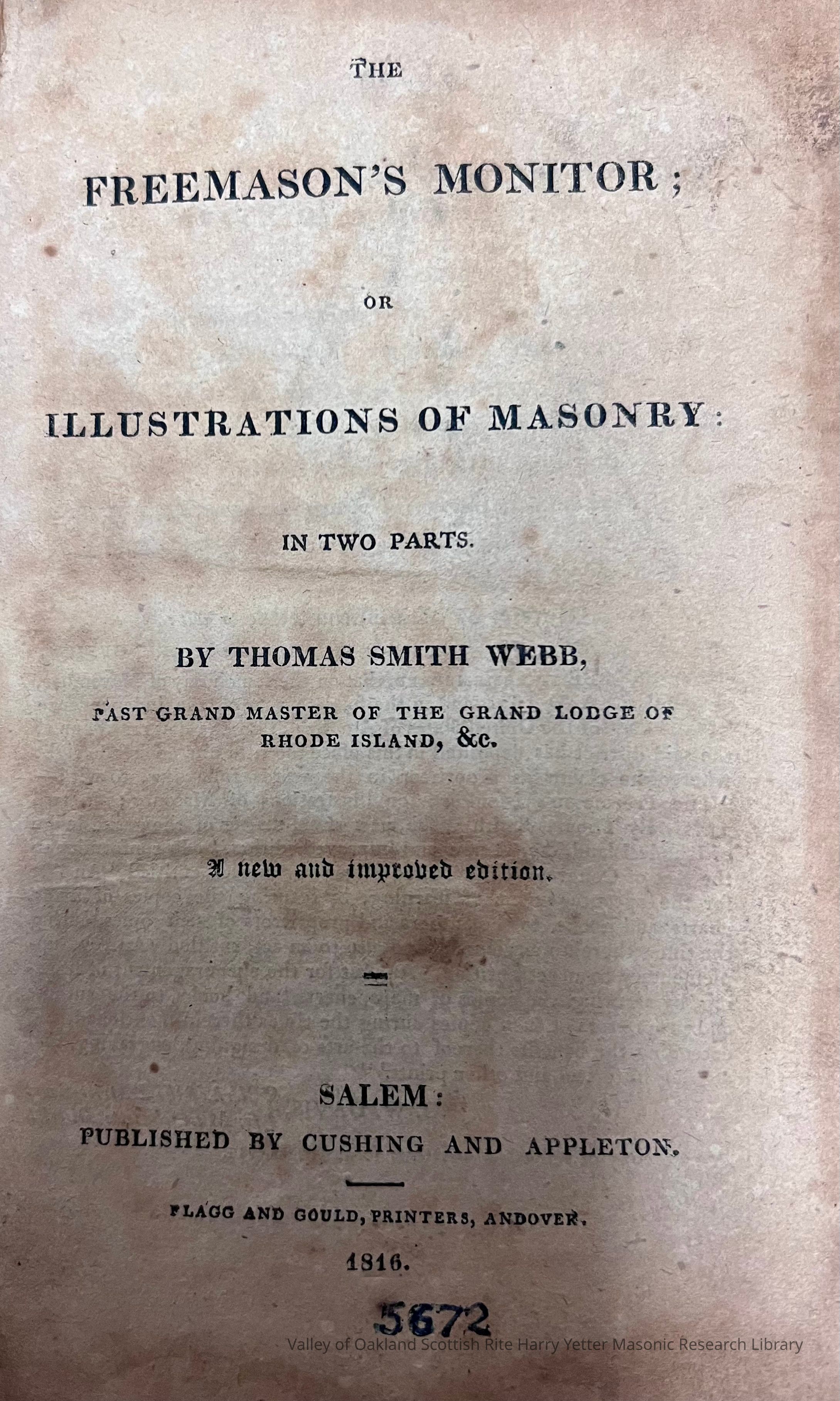 Thomas Smith Webb's influential work that influenced the landscape of Freemasonry in the United States.Collection