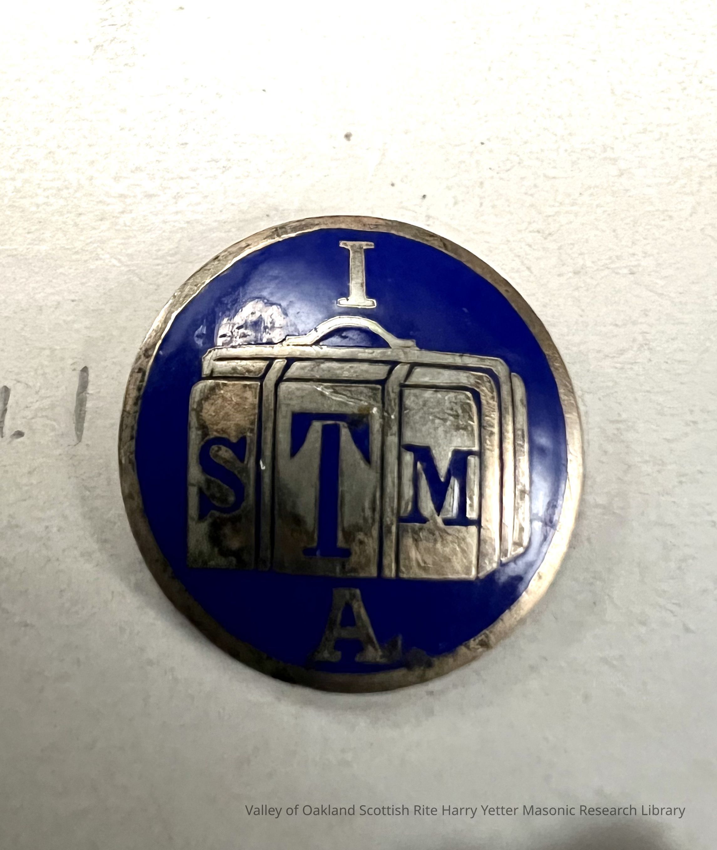 Blue enamel pin with gold lettering and symbol. Lettering is "I" "S" T" "M" A". As-yet Unknown origin.Context