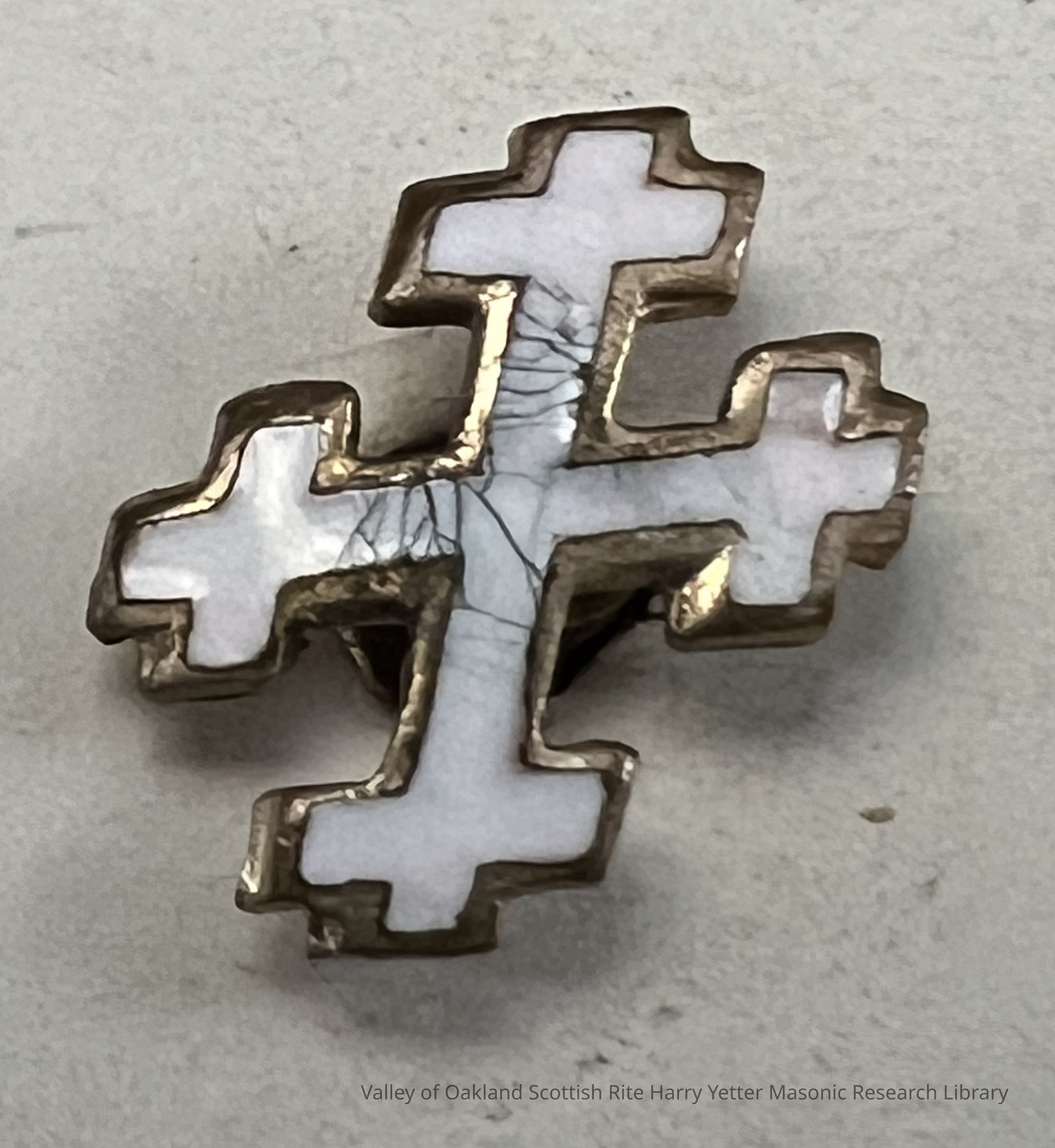 White enameled cross on gold pin. Name of cross needs further research. May be cross of Honorary Inspector Generals or the 33rd Degree.Use
