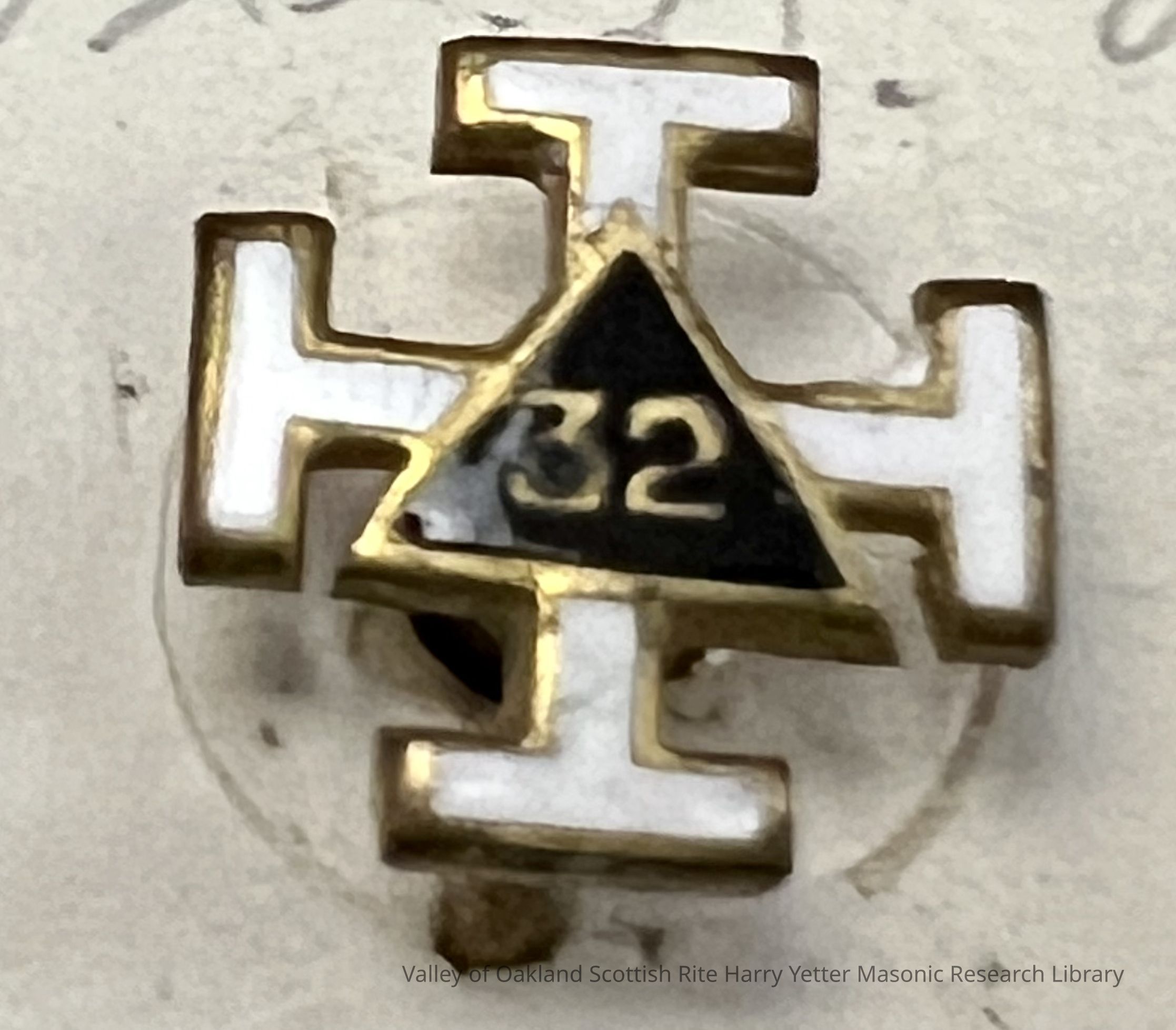 At the center, the number 32 appears referencing the 32nd degree rank of the Scottish Rite Freemason wearing this pin. Number encased in a black triangle, which is enlaced in a white Jerusalem Cross.Use