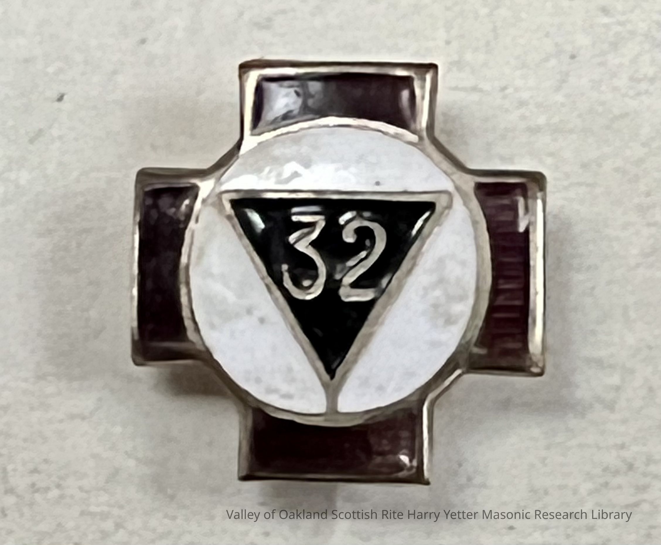32nd Degree Screw-back Pin. 32 number inverted within black triangle within a white circle encased in a red teutonic cross.Use