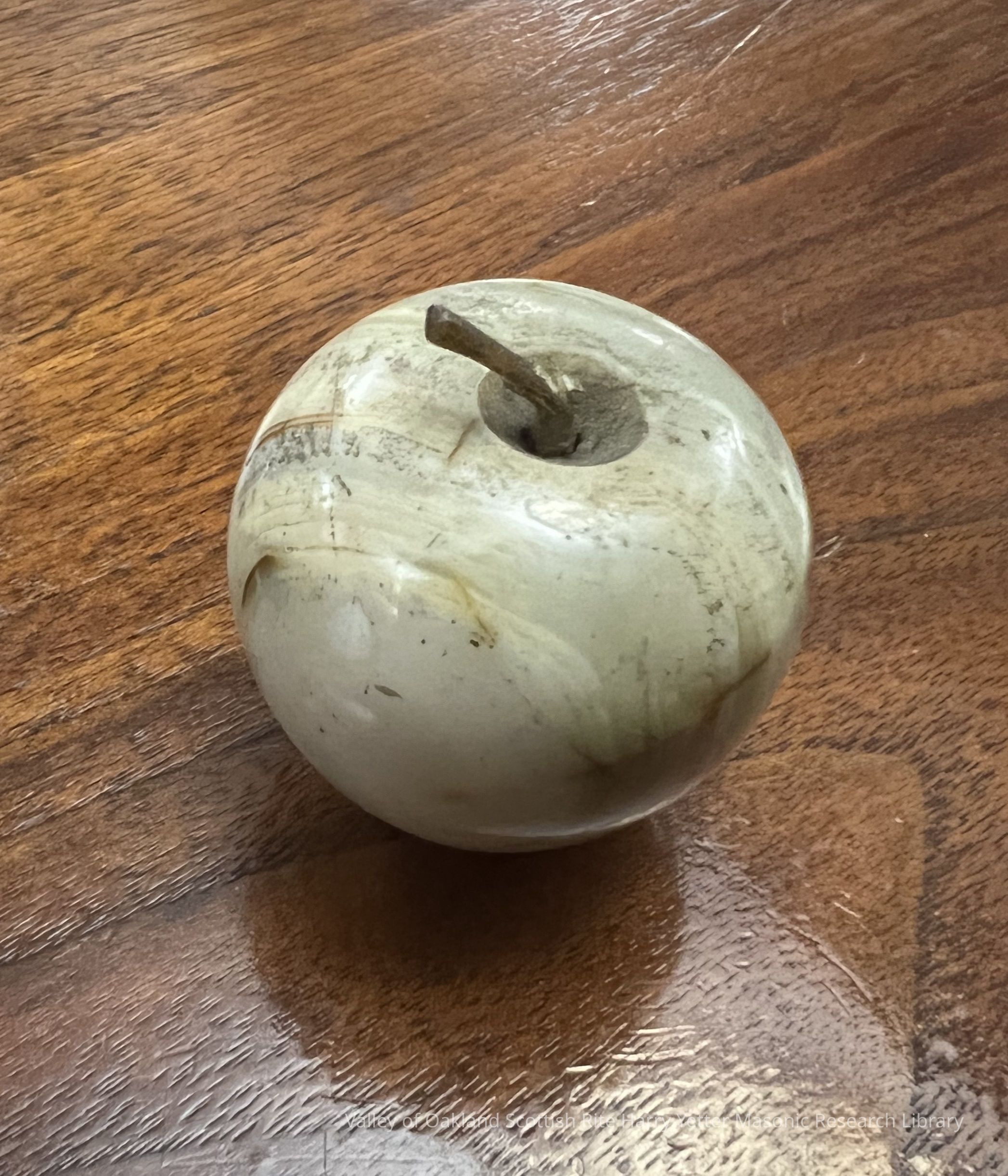 Quartz (may be of other stone) apple with a brass stem. From the James B. Merritt collection. Brought from Holy Land in 1900.Use
