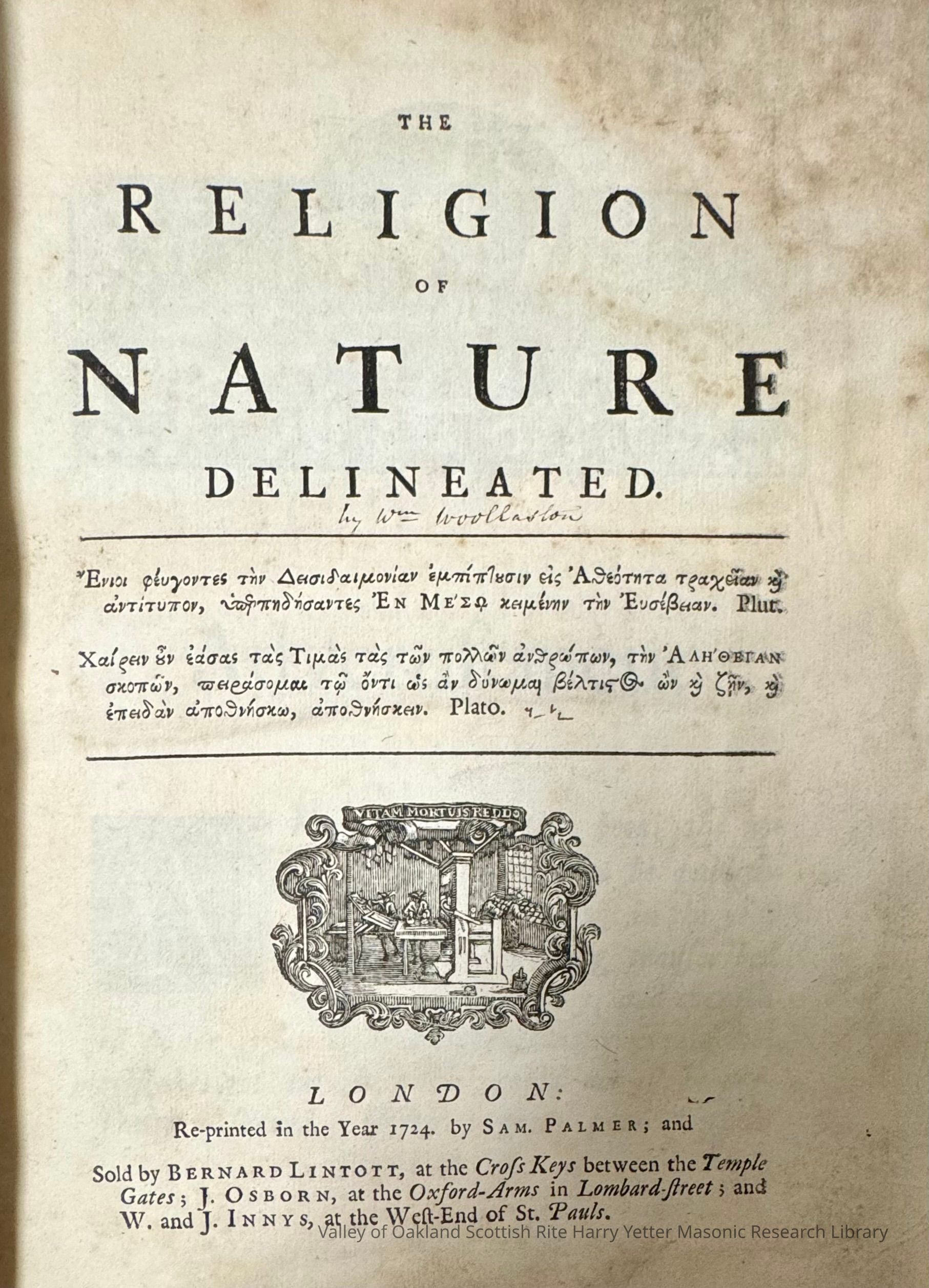 From the Wikipedia entry: The Religion of Nature Delineated is a book by Anglican cleric William Wollaston[1] that describes a system of ethics that can be discerned without recourse to revealed religion. It was first published in 1722, two years before Wollaston's death. Due to its influence on eighteenth-century philosophy and his promotion of a natural religion, the book claims for Wollaston a ranking as one of the great British Enlightenment philosophers, along with John Locke, George Berkeley, and David Hume. It contributed to the development of two important intellectual schools: British Deism, and the pursuit of happiness moral philosophy of American Practical Idealism which appears in the United States Declaration of Independence....Wollaston claimed originality for his theory that the moral evil is the practical denial of a true proposition and moral good the affirmation of it,[1] writing that this attempt to use mathematics to create a rationalist ethics was "something never met with anywhere". Wollaston "held that religious truths were plain as Euclid, clear to all who contemplated Creation."[2] Isaac Newton had induced natural laws from a mathematical model of the physical world; similarly, Wollaston was attempting to induce moral laws by a mathematical model of the moral world. See: https://en.wikipedia.org/wiki/The_Religion_of_Nature_DelineatedCollection