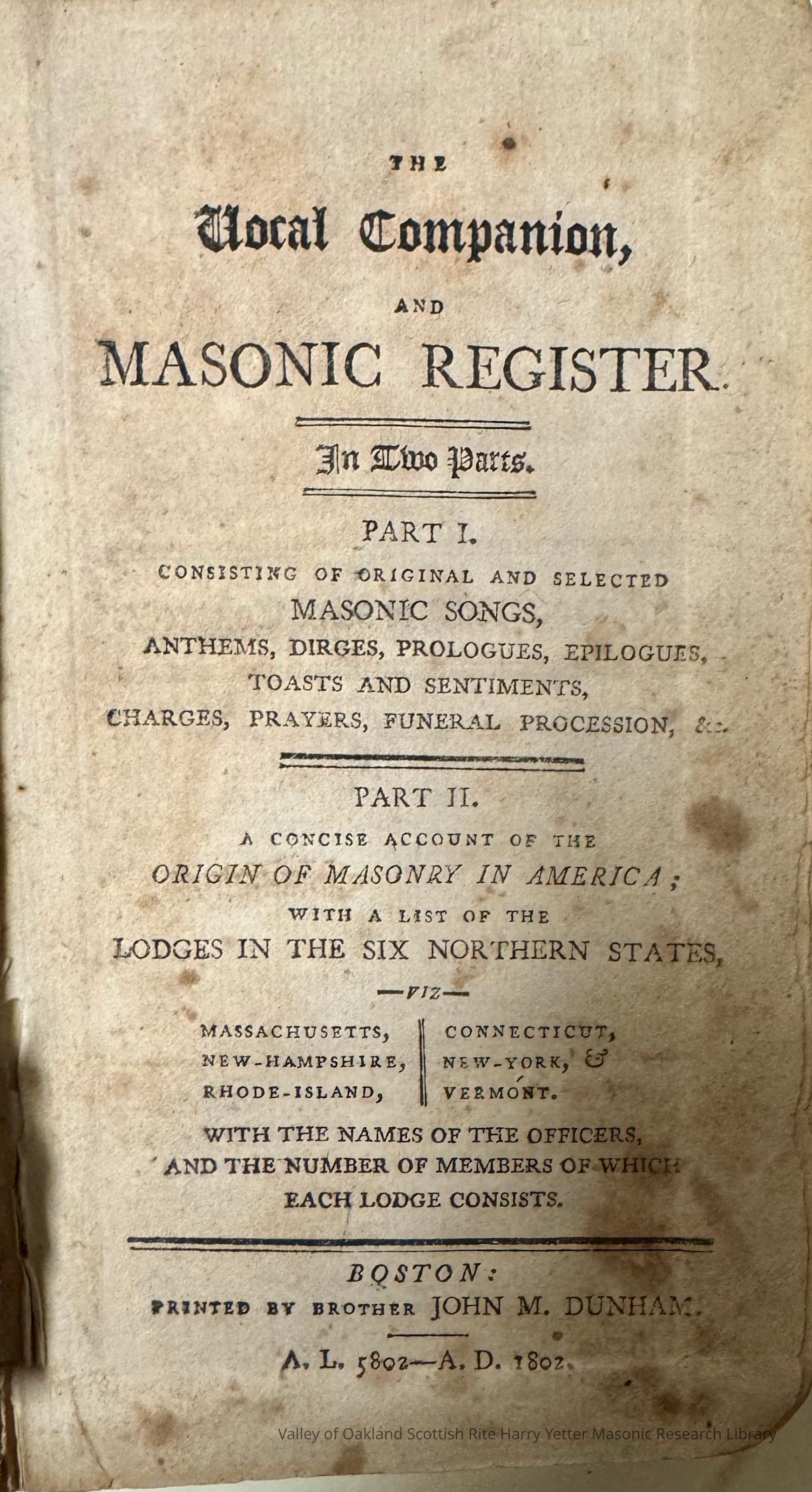 Vocal Companion and Masonic Register In Two parts, TheEntry/Object ID