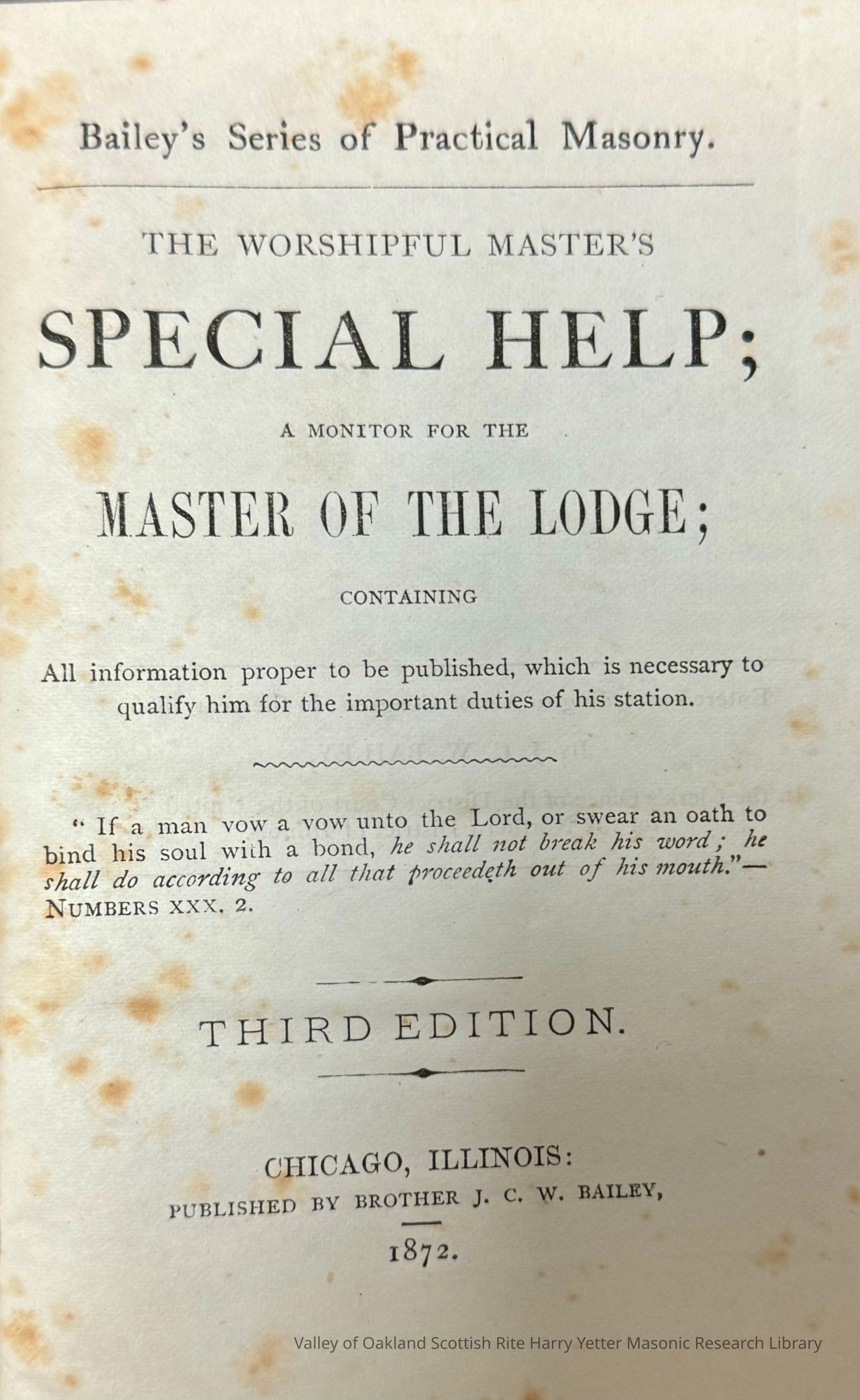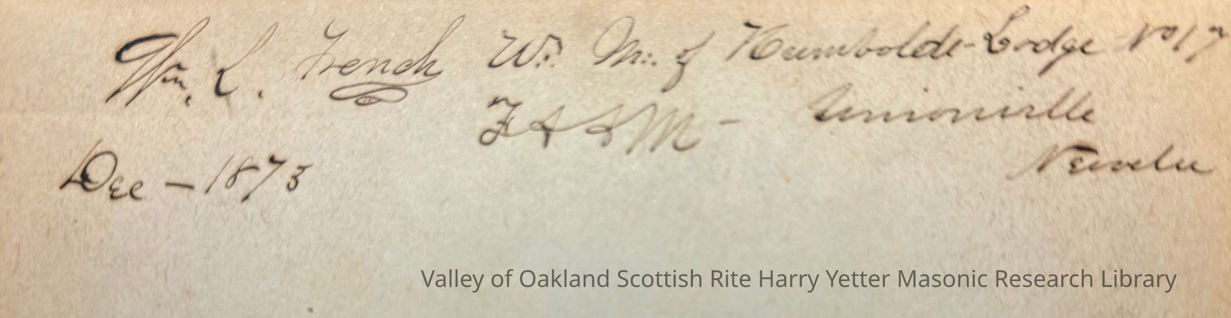 A seemingly ordinary book intended to provide general instruction for the master of a lodge, _The Worshipful Master’s Special Help…_(Third Edition, 1872), sat on our library’s shelf for the general reference of our Valley’s brethren. Like most of our collection, this publication includes an inscription by its owner. On the flyleaf is written in ink, “Wm. L. French WM of Humboldt Lodge no. 17 F. & AM – Unionville, Nevada, Dec – 1873.”