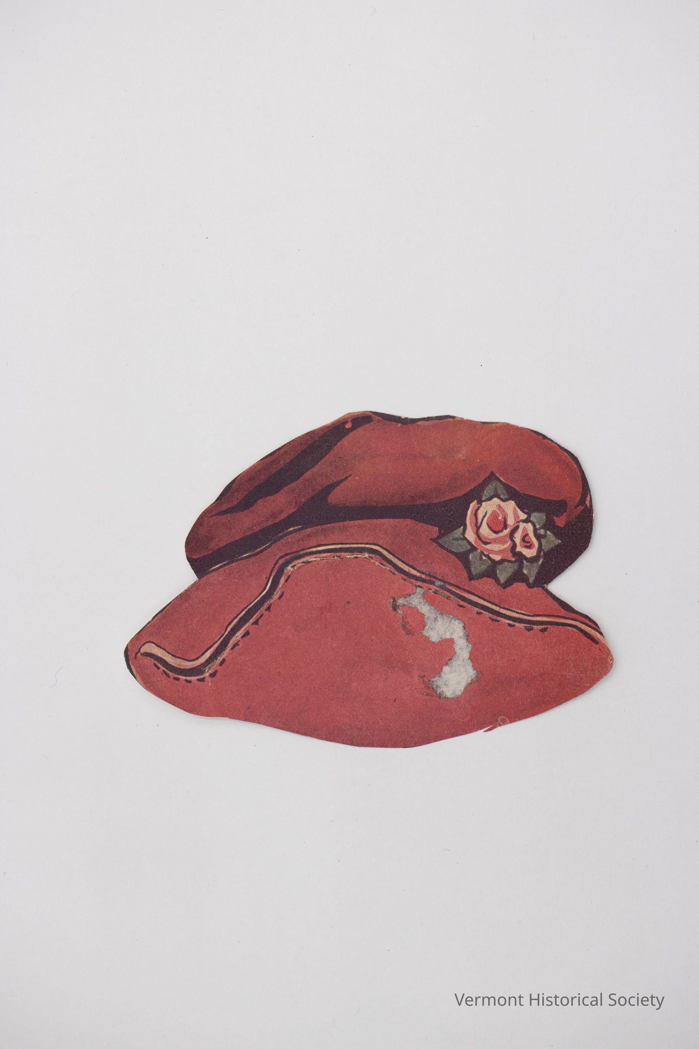 Red, printed paper cloak hood for a paper doll. It has a soft crown and a downturned brim. The back shows a portion of a sales catalog page and the handwritten label, "Leota".Context