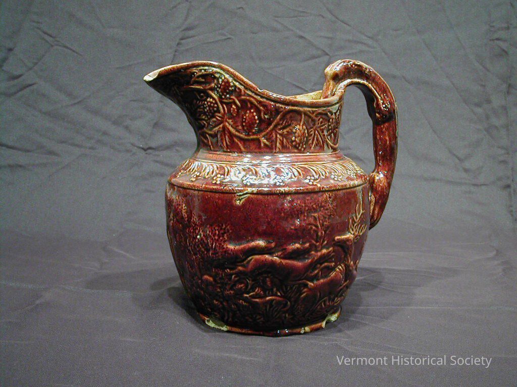 Brown ceramic pitcher molded with a hunt scene. The body of the pitcher is molded with a scene of a pack of dogs hunting a stag. The shoulder is molded with leaves or grass and flowers. The spout is molded with a vine of fruits or flowers. The handle is in the shape of a hound whose nose is pointed downward into the pitcher.