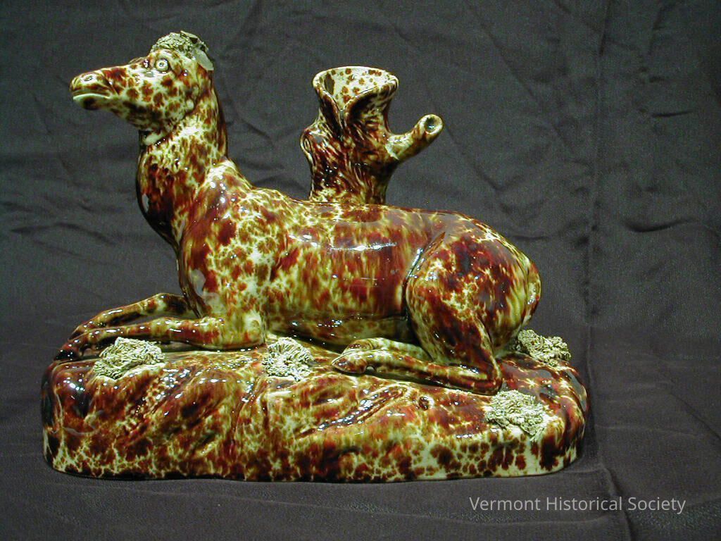 Large figural vase in the shape of a deer laying next to a tree stump. The whole work is glazed with mottled brown. The deer is facing to the left with wide eyes. The antlers are broken off. There is rough, extruded ceramic clumps attached to the base and the top of the deer's head, represent grass and fur respectively. The tree stump is hollow, acting as a bud vase.