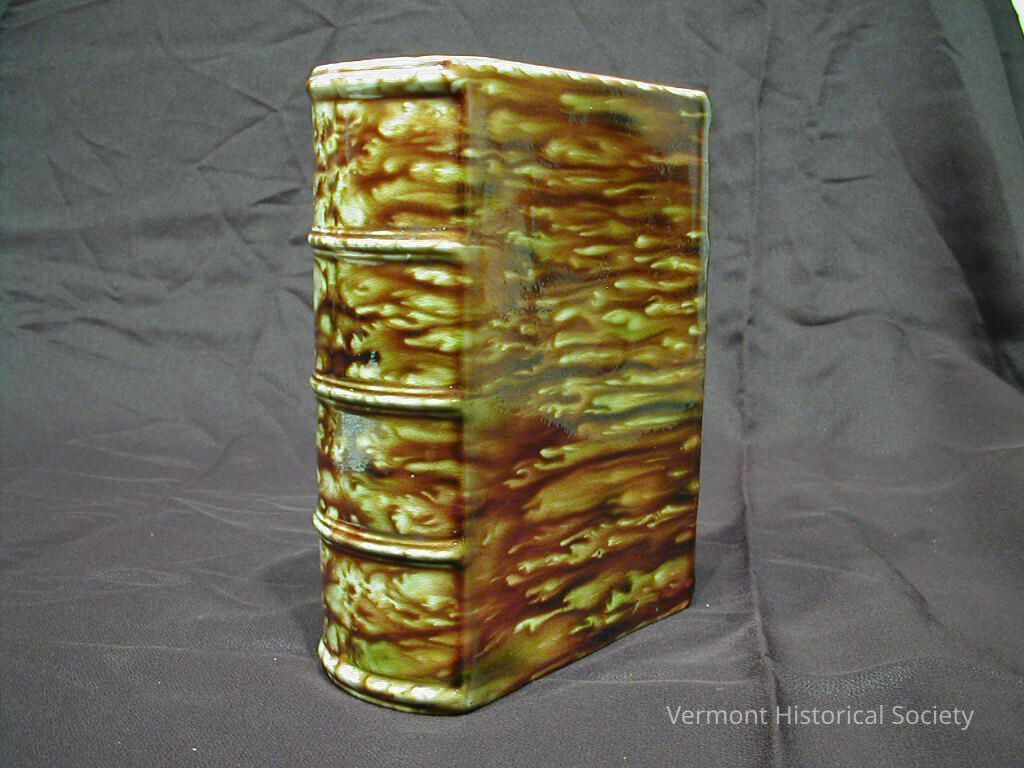 Ceramic flask in the shape of a book. It is glazed with a runny, brown glaze. There is a small hole at the top of the book.