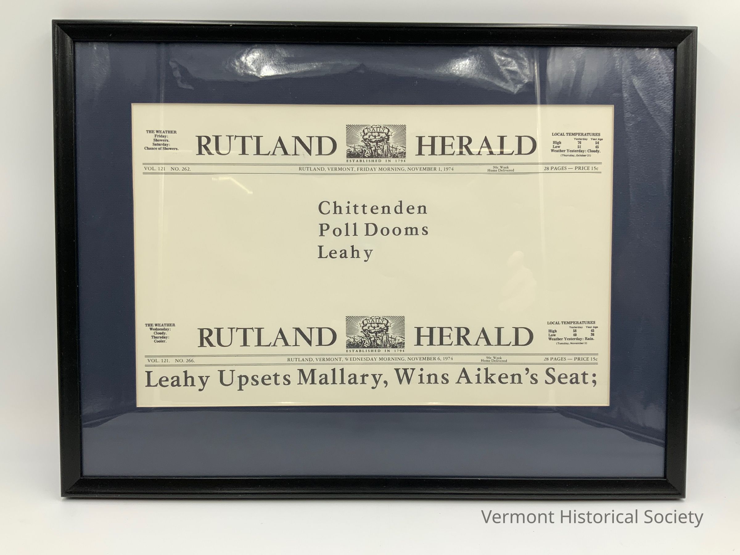 Framed print showing the upper front page of two Rutland Herald newspapers. The top bears the headline, "Chittenden Poll Dooms Leahy", while the bottom bears the headline, "Leahy Upsets Mallary, Wins Aiken's Seat;".