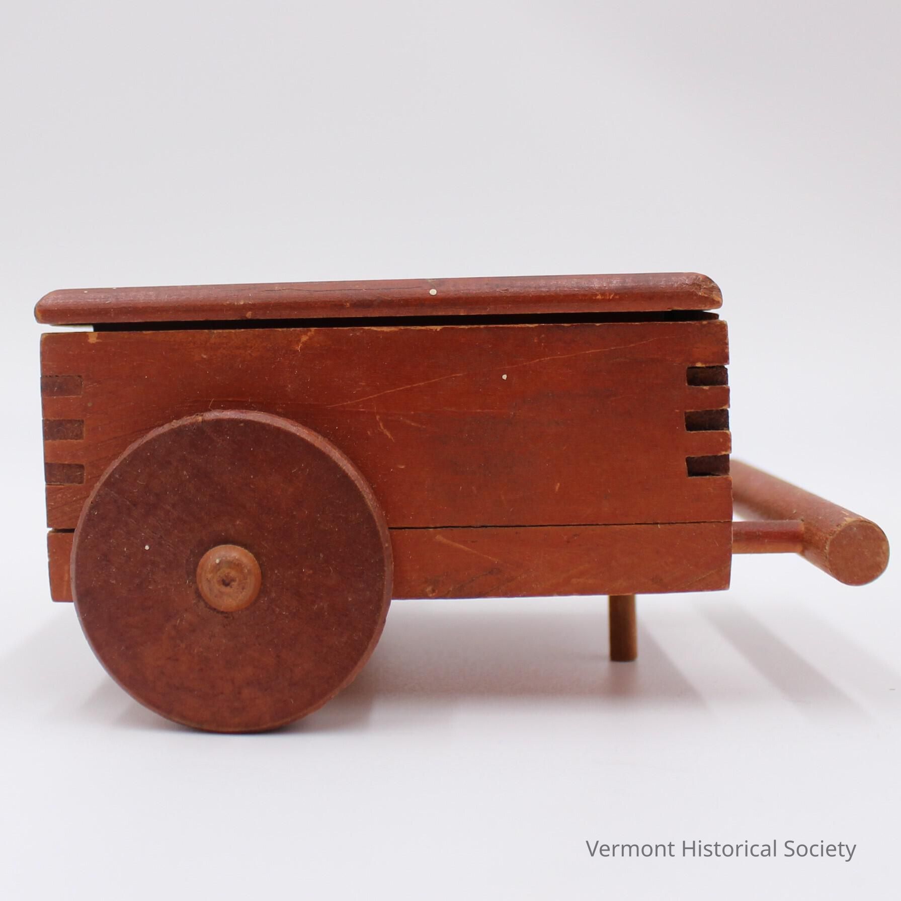 Wooden trinket box in the shape of a wheelbarrow or wagon. The box has two disk wheels and a peg stand. The side opposite the wheels has a horizontal handle spanning the width. The whole is painted red, and the lid is printed with the words, "Randolph, Vt."