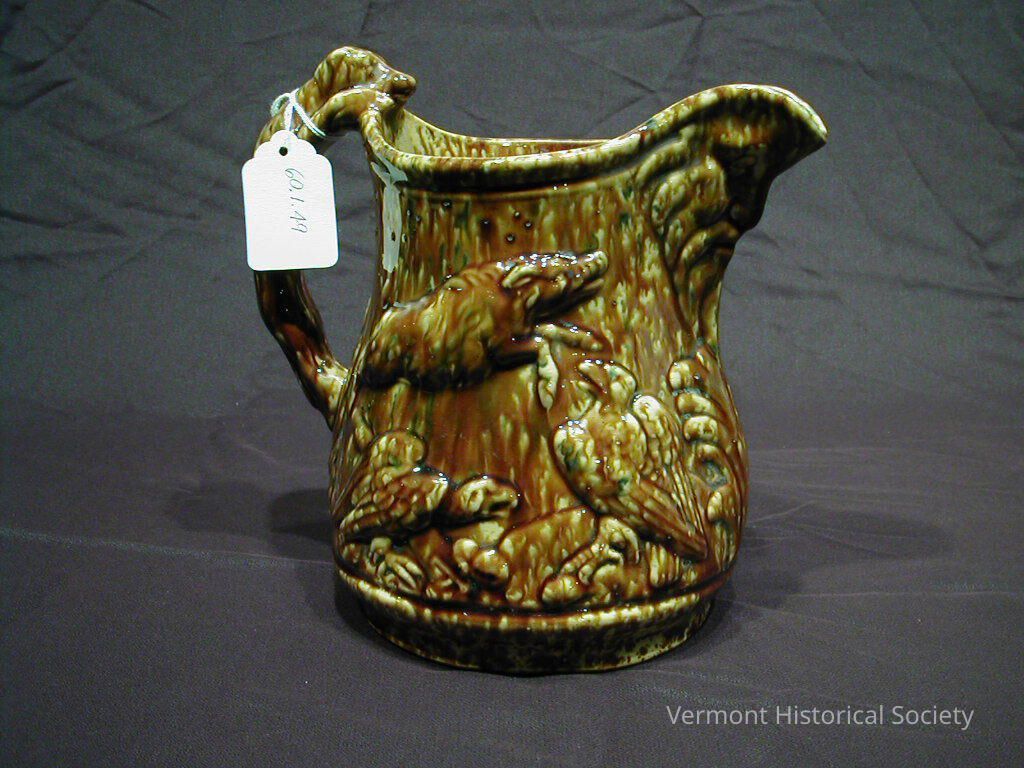 Large pitcher with mottled brown and green glaze decoration. The round body of the pitcher is molded with animals. While patterned after a hunt scene, the animals shown are pigs and eagles. The handle is molded into the shape of a hound whose nose is pointed downward into the pitcher. The pouring spout is molded with a man's head.