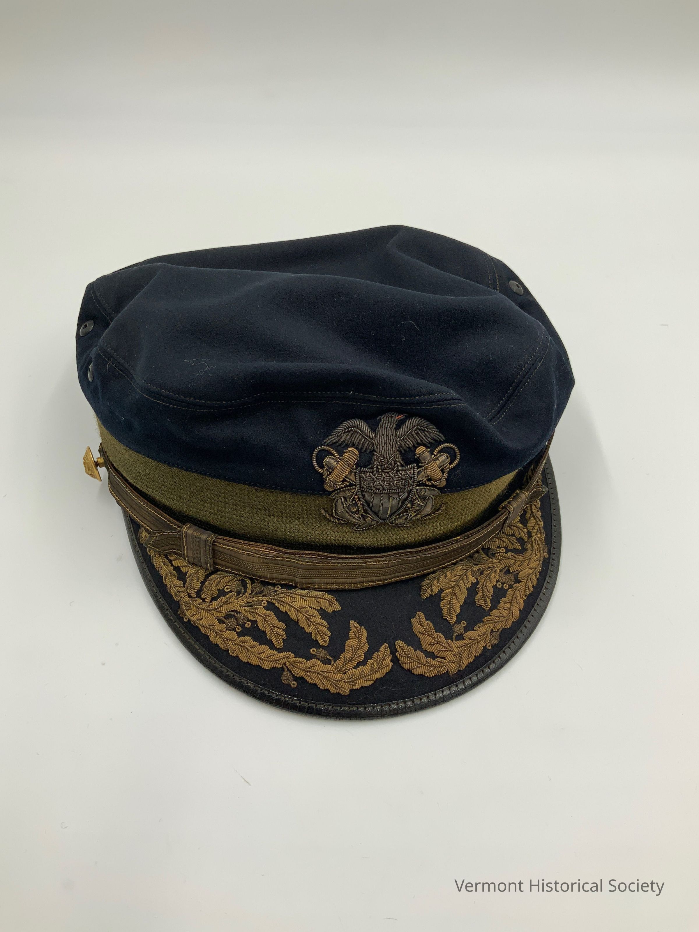 US Navy service cap with a dark blue wool crown and a black, rounded brim. The front of the cap has a embroidered gold design of an eagle sitting atop a federal shield, with two crossed fouled anchors behind the shield. The brim of the cap is also embroidered in goldwork with a pattern of oak leaves and acorns. The gold strap along the brim has a brass button on either side. The stiffener in the crown of the cap is missing.
