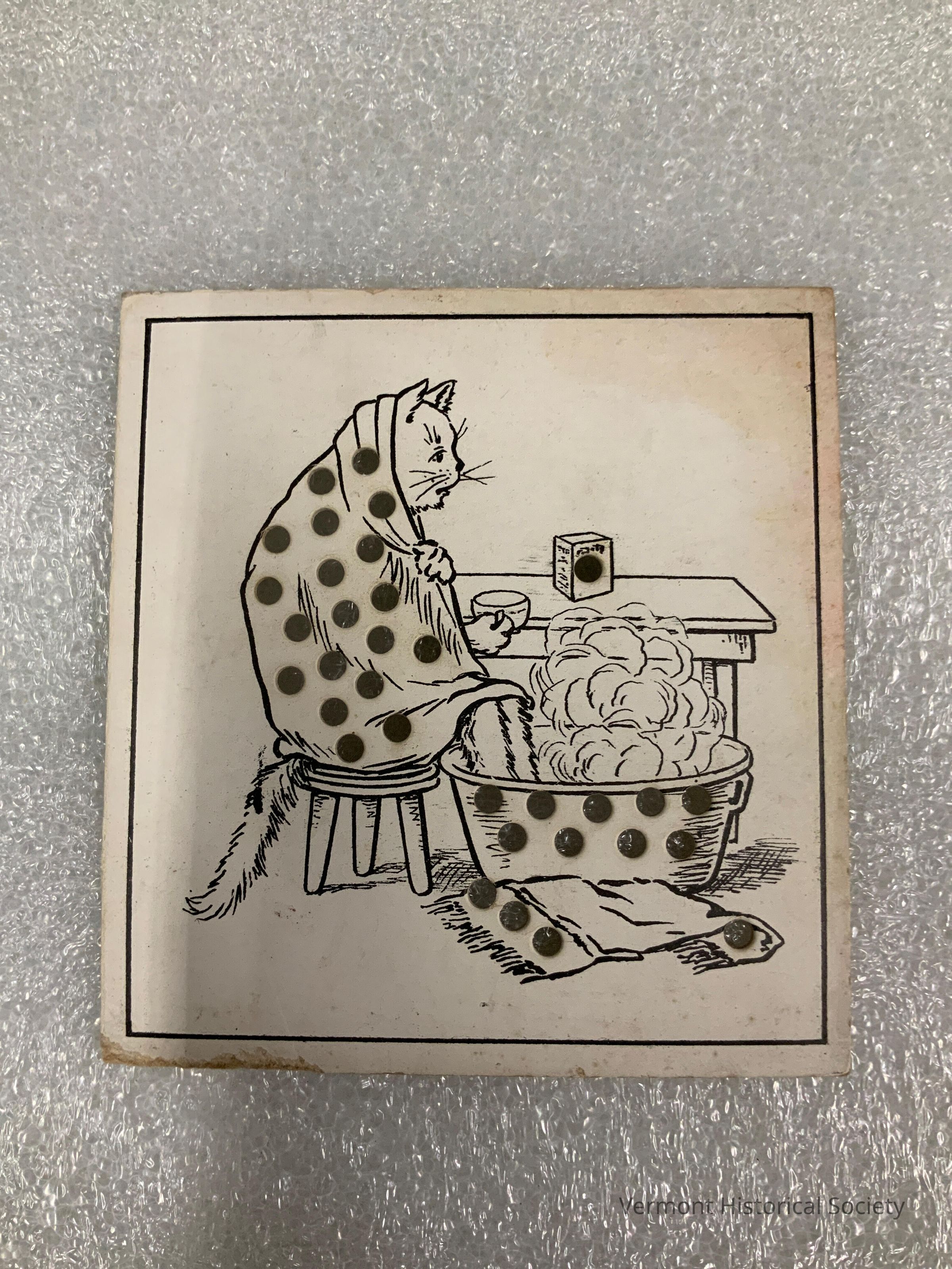 Square rectangular sewing card printed on one side with an illustration of a cat wrapped in a blanket soaking its feet in a basin. The cat is sitting on a stool holding the blanket around itself with one hand and holding a cup with the other hand. There is a towel on the floor, and a table framing the back of the image. The blanket, basin, and towel are punched throughout with round holes.Acquisition