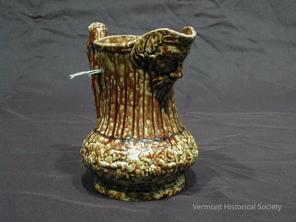 Ceramic cream pitcher with mottled brown glaze. The pitcher has bulbous lower body with a long, convex neck that culminates in a wide pouring spout. The body is molded with a low-relief design of a grapevine. The handle is in the shape of a twisted grape vine. The neck is slightly fluted. The spout is molded with a man's head framed at the top with acanthus or oak leaves and at the bottom with a pointed beard.