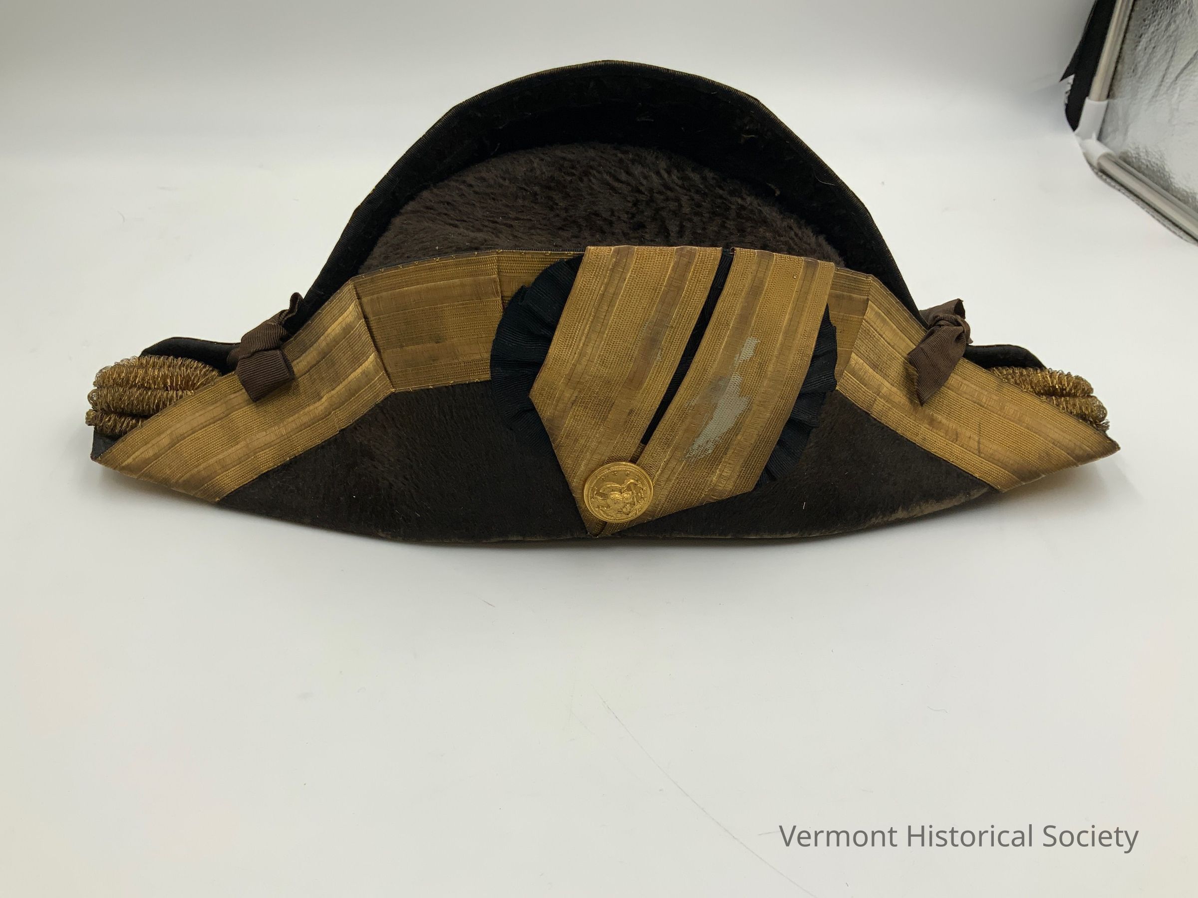 Black fur bicorn hat. The edge of the brim is decorated with wide, gold ribbon. There is a round black cockade on one side held by a strap of the same wide, gold ribbon and a brass button. There is a gold tassel on each flat side of the brim.