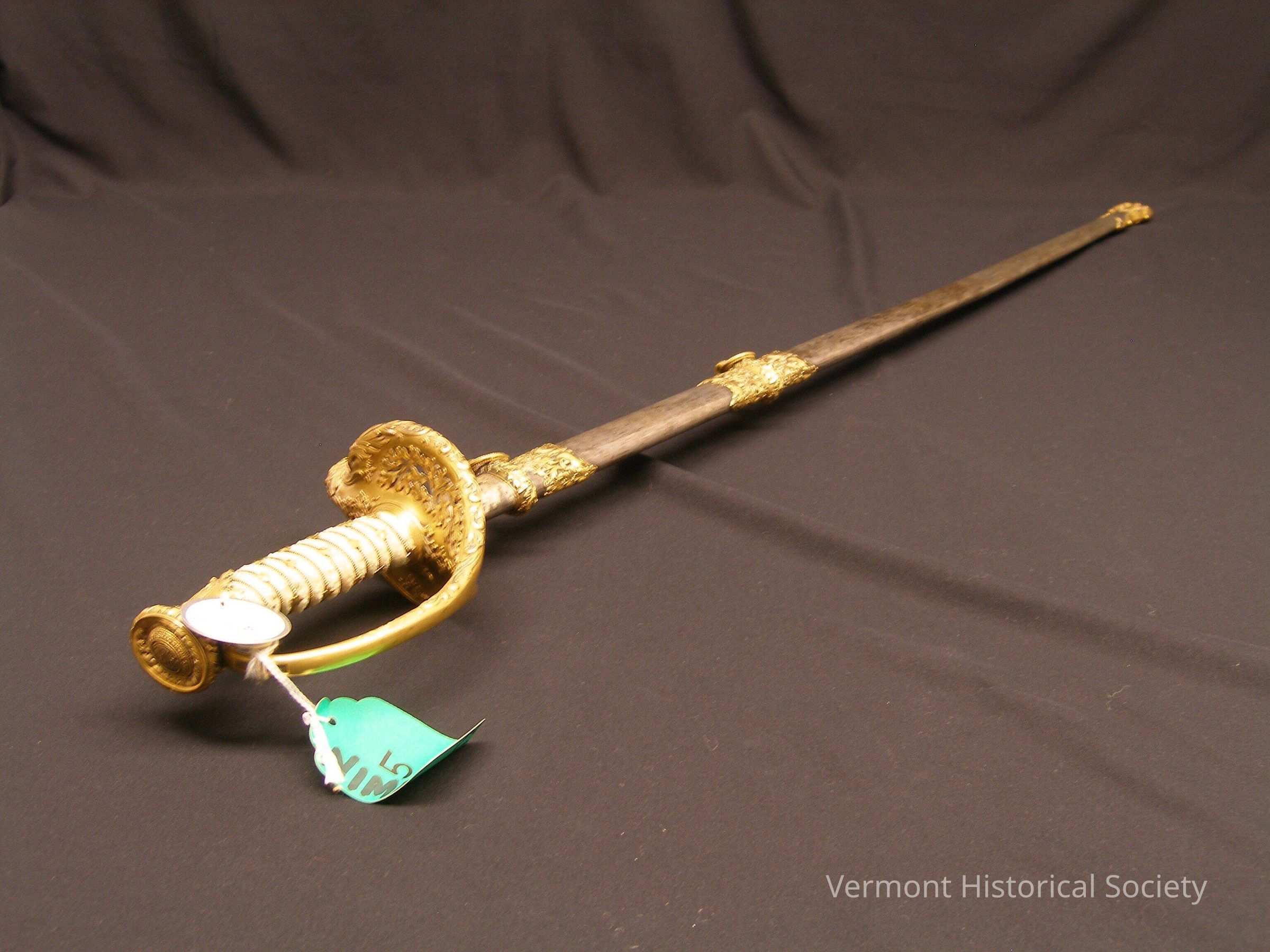 Ornate sword and accompanying scabbard. The grip of the sword is white shagreen, wrapped with twisted gold wire and embellished with gold stars. The guard, knuckle guard, and pommel are ornately chased gold in a floral pattern with an eagle and United States shield at the front of the pommel. The blade is heavily engraved with the names of ships and heavy florals. The scabbard is silver with gold locket/mouthpiece, chase/tip protector, and hook attachement.Context