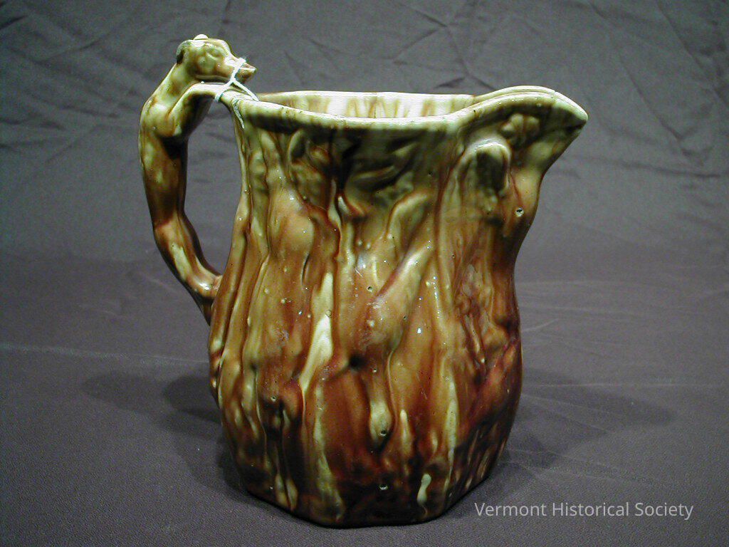 Ceramic pitcher with runny brown glaze. The body of the pitcher is molded with a low-relief design of game hanging up by their feet. The represented animals include a duck, a rabbit, and a stag. The handle is molded in the shape of a house with its nose pointing into the pitcher. The spout is molded with an eagle with its wings spread wide.