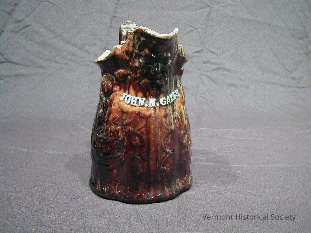 Ceramic pitcher with mottled brown glaze. The body of the pitcher is relief molded with tulip sprays. The spout is molded with a bearded man's face. Beneath the face is the name, "JOHN M. GATES", both molded and painted white.