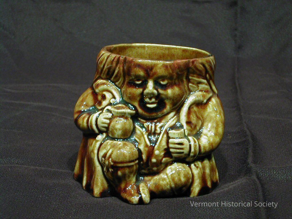 Tobacco jar in the shape of a seated man with mottled brown glaze. The man is wearing eighteenth-century-style clothing. He is holding a pitcher in his right hand, propped on his raised right thigh, and he is holding a cup in the other hand, propped on his lowers left knee. The lid, presumably in the shape of a hat, is missing.